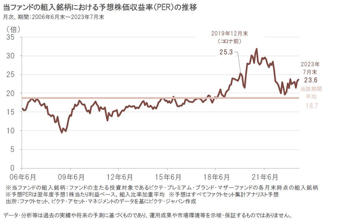 当ファンドが投資しているプレミアム・ブランド企業の株式における足元(2023年7月末時点)の予想株価収益率(PER)注は、過去平均(期間:2006年6月末~2023年7月末)を上回る水準ではあるものの、コロナ前の水準をやや下回る水準です。足元の予想PERからみると、過度な割高感はなく、妥当なバリュエーション(投資価値評価)水準であると考えています。