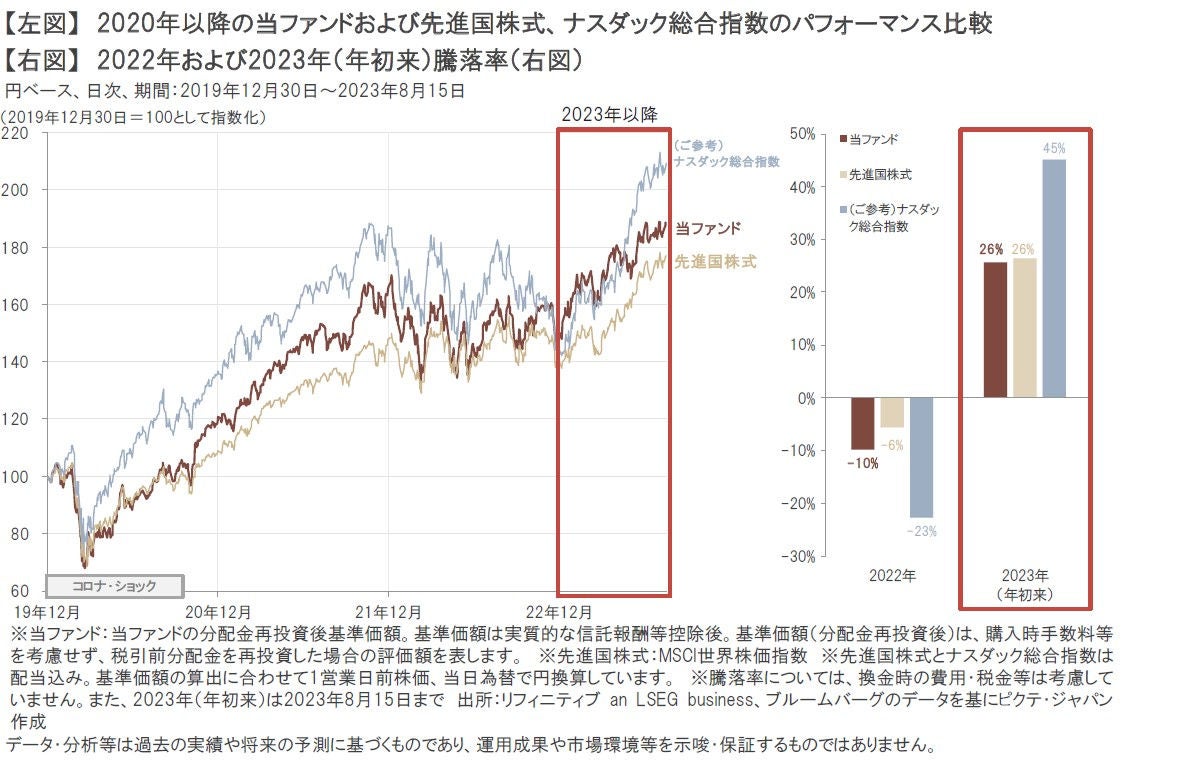 こうした市場環境下、当ファンドの投資先であるプレミアム・ブランド企業の株価は、ゼロコロナ政策終了後の中国市場の回復期待を背景に、2022年後半から2023年5月半ばにかけて、先進国株式を大きく上回る上昇となりました。それ以降は、株式市場におけるAIブームとは関連が乏しいことや、中国の景気回復の遅れを受けた懸念の高まりなどもあり、株価は上昇・下落を繰り返す展開となりました。しかし、こうした流れの中でも、2023年年初来の当ファンドの分配金再投資後基準価額は、2023年8月15日までで、+26%と上昇となりました。