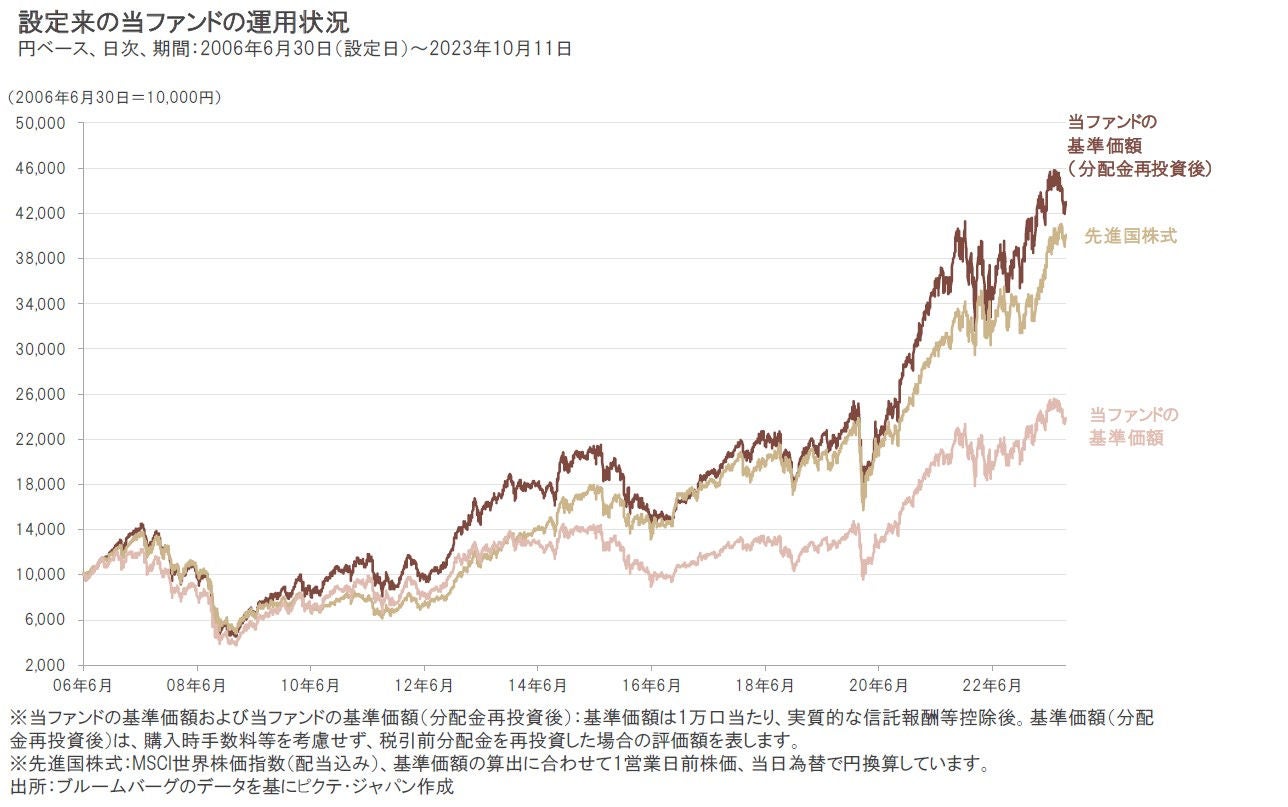 こうした市場動向を背景に、当ファンドの基準価額(分配金再投資後)は2023年年初来、足元(計算期間:2022年12月30日~2023年10月11日)まででみると+18.0%の上昇となりましたが、下期以降(同:2023年6月30日~10月11日)だけみると株式要因のマイナスが響き、-5.1%の下落となりました。
