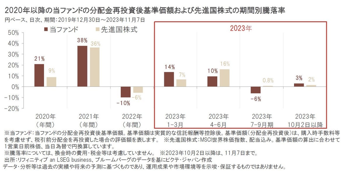 2023年年初来、足元(2023年11月7日)までの当ファンドの分配金再投資後基準価額(以下、当ファンド)は+20%の上昇となりました。投資先であるプレミアム・ブランド企業の株価が上昇したことによる株式要因のプラス寄与に加えて、主要通貨に対して円安が進行したことによる為替要因のプラス寄与からも恩恵を受けました。