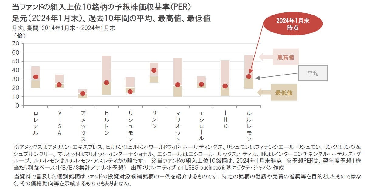 短期的には、世界経済の先行き不透明感や足元の中東情勢の緊迫化など地政学リスクの高まりなど、プレミアム・ブランド企業の業績や株価動向にマイナスの影響を及ぼす懸念材料は完全には払しょくされていませんが、中長期的にみたプレミアム・ブランド企業の株式への投資の魅力には変わりがないと考えています。