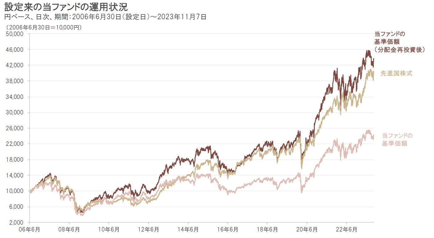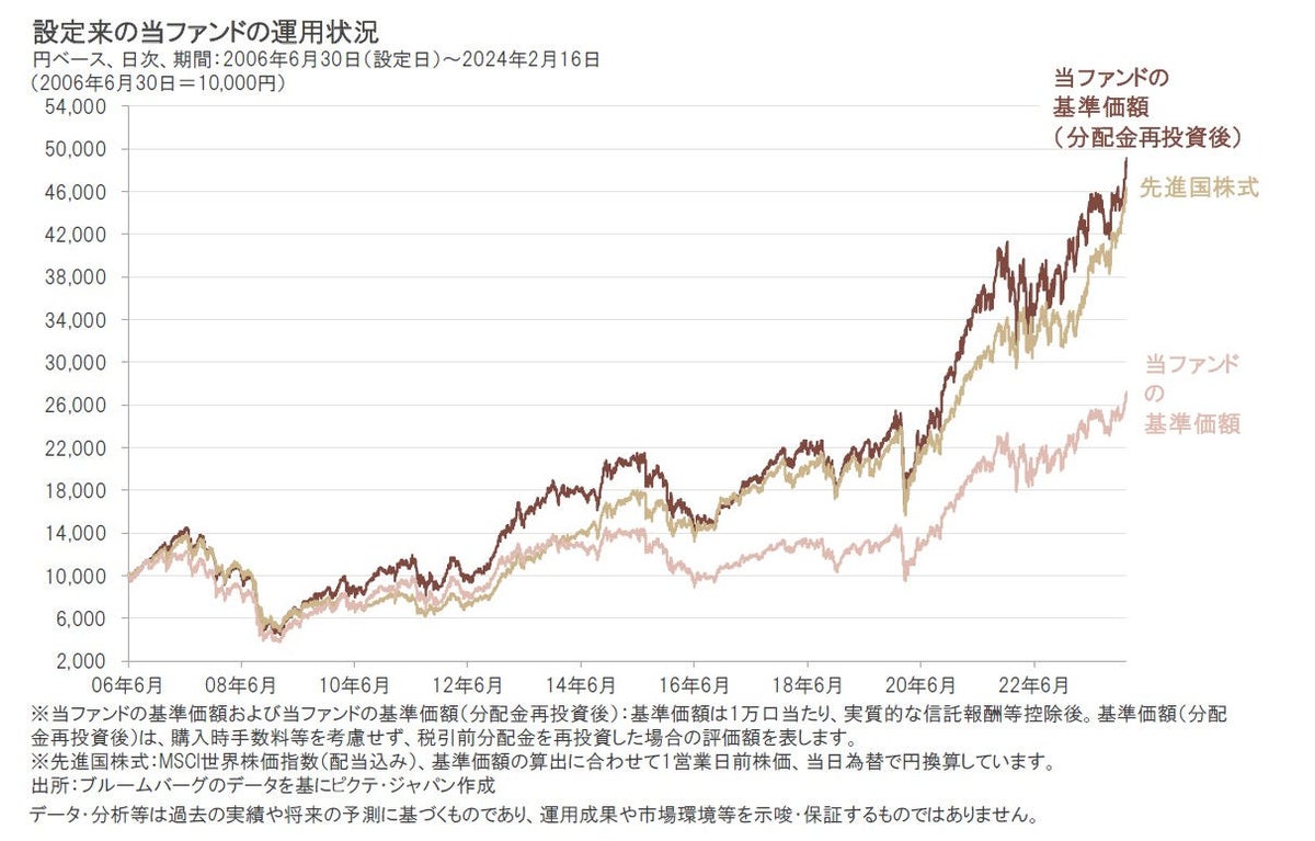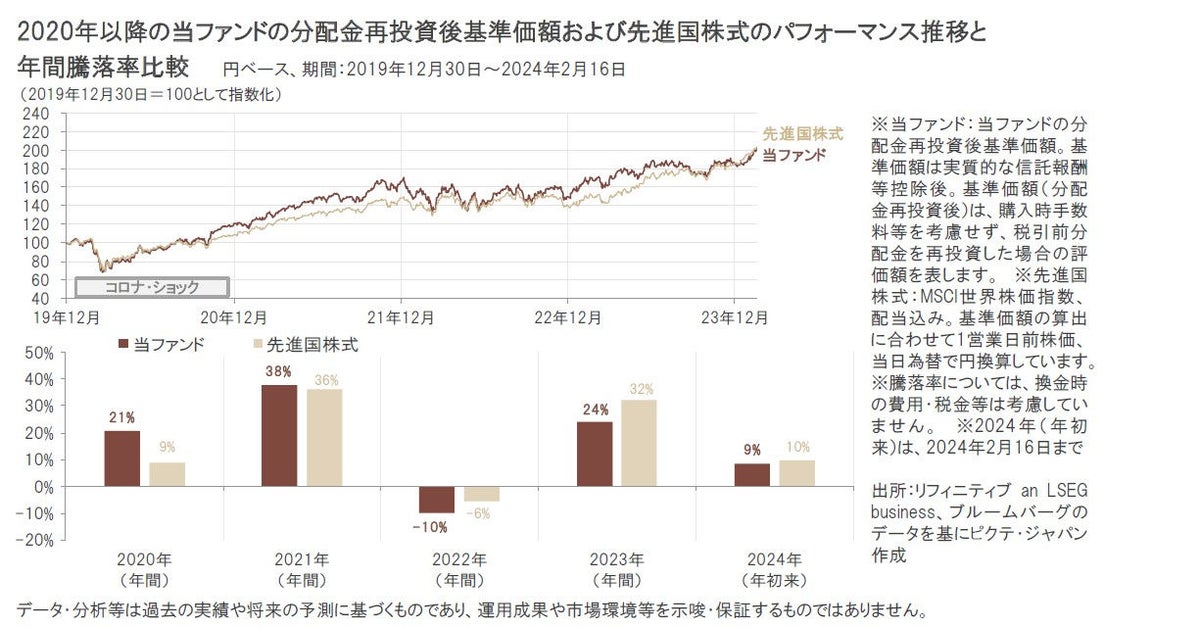 2024年年初来、足元(2024年2月16日)までの、当ファンドの分配金再投資後基準価額は+9%の上昇となりました。投資先であるプレミアム・ブランド企業の株価が上昇したことによる株式要因のプラス寄与に加えて、主要通貨に対して円安が進行したことによる為替要因のプラス寄与からも恩恵を受けました。また、同期間における先進国株式(MSCI世界株価指数、円換算ベース)(+10%)と同程度の上昇率となりました。