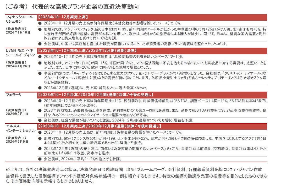 当ファンドの投資対象であるプレミアム・ブランド企業は、「消費関連」銘柄です。そのため、株式市場におけるハイテク・ブームの流れとは関連が薄いと考えられますが、2024年年初来のプレミアム・ブランド企業の株価も、上昇しています(2024年2月16日時点)。こうした背景の1つには、プレミアム・ブランド企業から発表された直近決算において、概ね底堅い需要が続いていることが示されたことがあると考えられます。