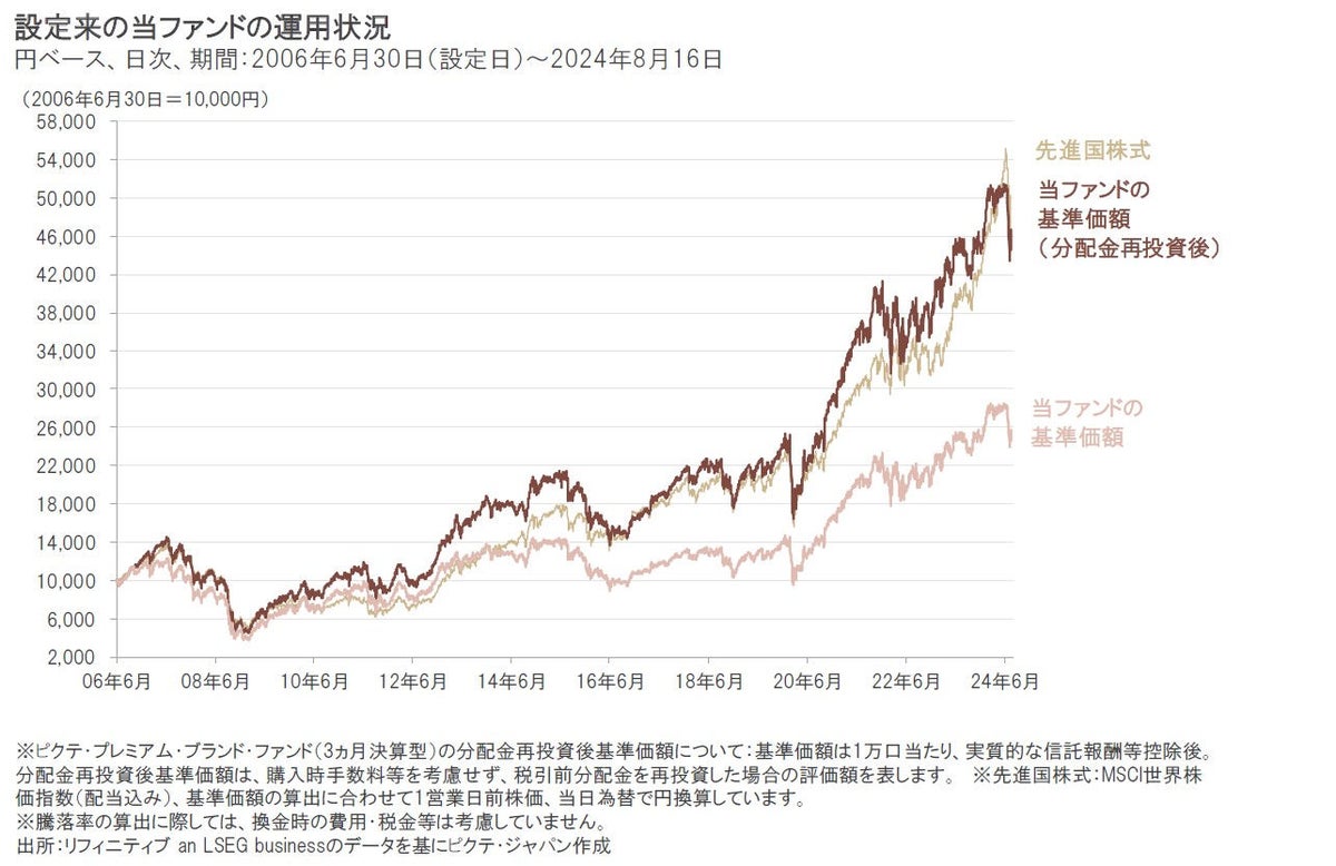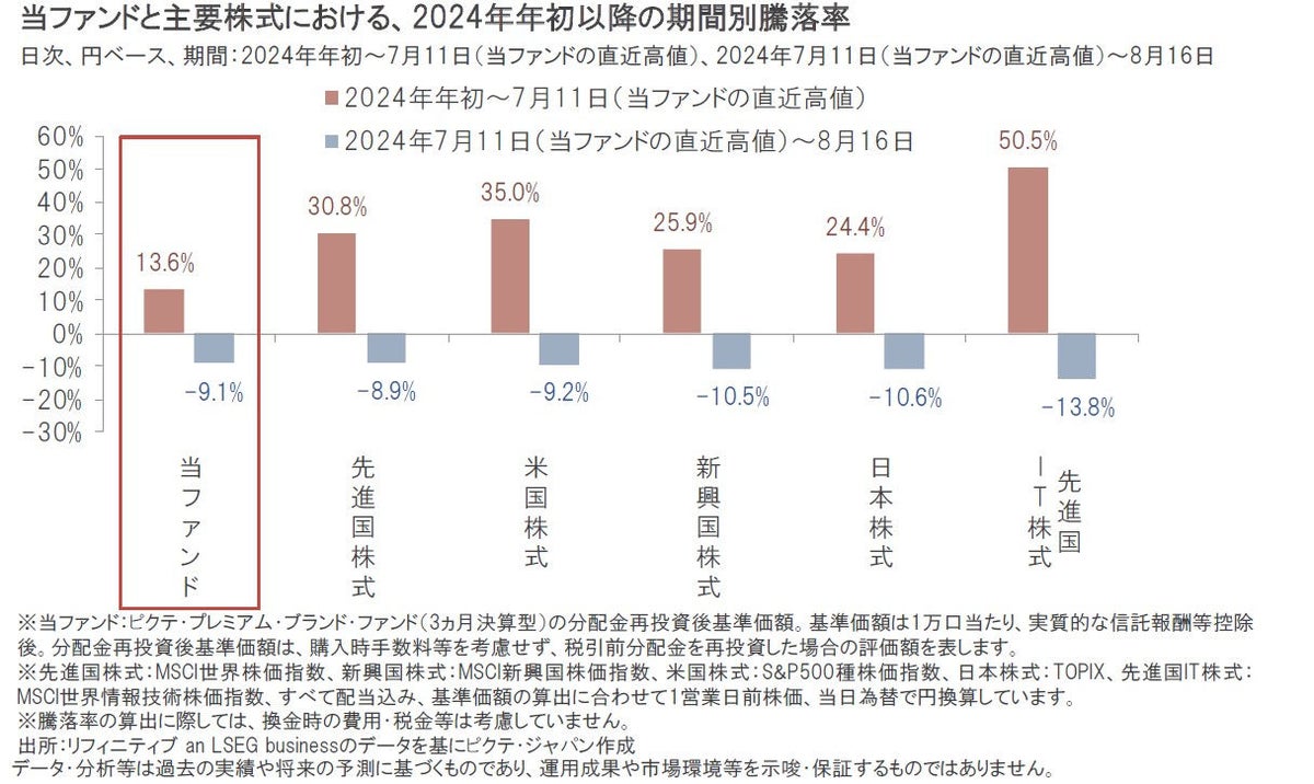 2024年7月以降、世界の金融市場が大きく変動するなか、当ファンドの分配金再投資後の基準価額も、直近高値(2024年7月11日)から、足元(8月16日)までで-9.1%の下落となりました。今後、短期的には相対的なバリュエーション面での魅力や、金融緩和による景況感改善期待などがプレミアム・ブランド企業の株価の支援材料になるとみられます。