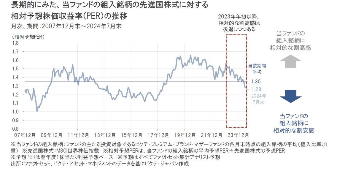 当ファンドが投資しているプレミアム・ブランド企業の株式(=当ファンドの組入銘柄)における足元(2024年7月末時点)の予想株価収益率(PER)注は、22.3倍と、過去10年間の平均(期間:2014年7月末~2024年7月末、21.6倍)をやや上回る水準ではあるものの、コロナ前の水準(2019年12月末、25.3倍)を下回っています。