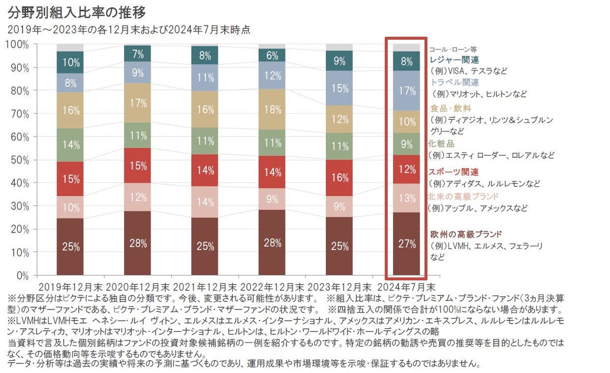 こうした決算動向や市場環境を勘案し、当ファンドにおいては、より保守的なポートフォリオを構築しています(2024年7月末時点)。サブセクター別にいうと、当ファンドのコア的な存在の高級ブランド分野については、2023年12月末比でやや組入比率を引き上げています。これは顧客から根強く支持され、高収益性を維持しているハイエンドの企業に限って組入比率を引き上げた結果です。また、堅調な旅行需要を背景に、トラベル関連も相対的に高位を維持しています。一方、スポーツ関連、化粧品、食品・飲料の分野については、需要回復が遅れていることなどから、組入比率を抑制しています。