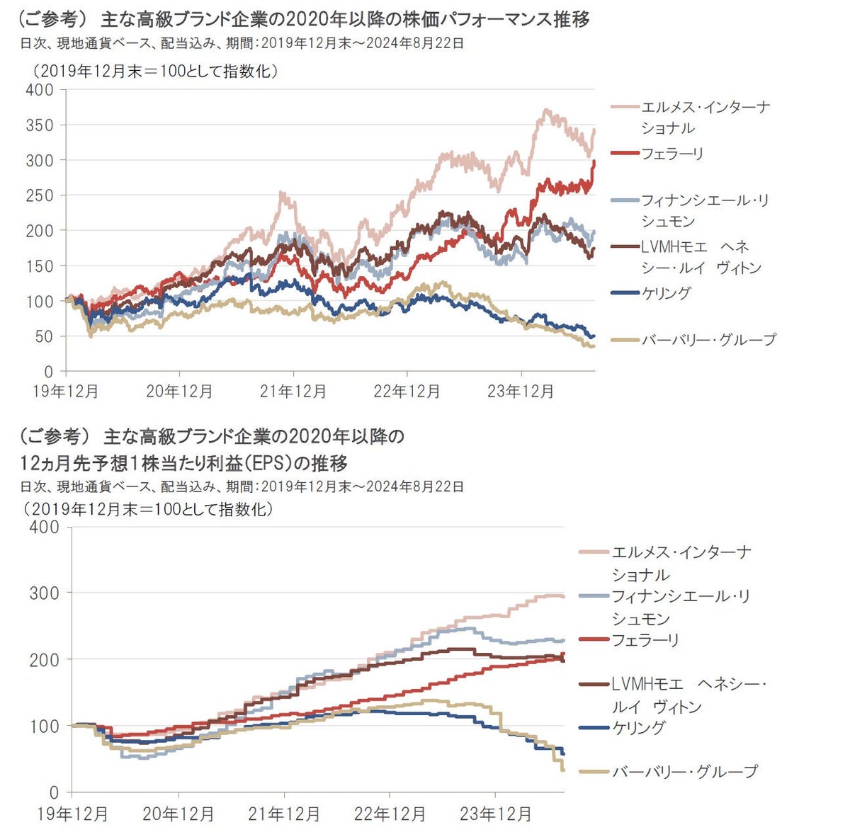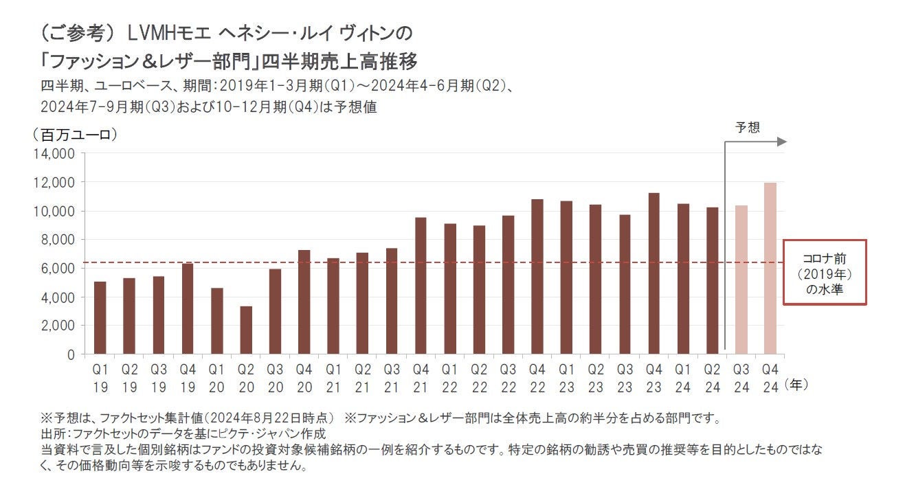 また、多くの高級ブランド企業については、コロナ後のリベンジ消費という特殊要因を受けた高成長から、通常時の成長率に収れん(=正常化)していく過程で、2024年4-6月期の売上高の伸びは低調なものとなると予想されていました。世界最大の高級ブランド企業であるLVMHモエ ヘネシー・ルイ ヴィトン(フランス)の2024年4-6月期売上高は前年同期比(為替変動等の影響を除いたベース)+1%にとどまり、市場コンセンサス(同+2%)を下回りました。ただし、同社の主力ブランドである「ルイ・ヴィトン」を中心としたファッション&レザー部門の足元の売上高をみると、コロナ前(2019年)を依然として上回っており、底堅い需要が存在していることには変わりがないと考えられます。