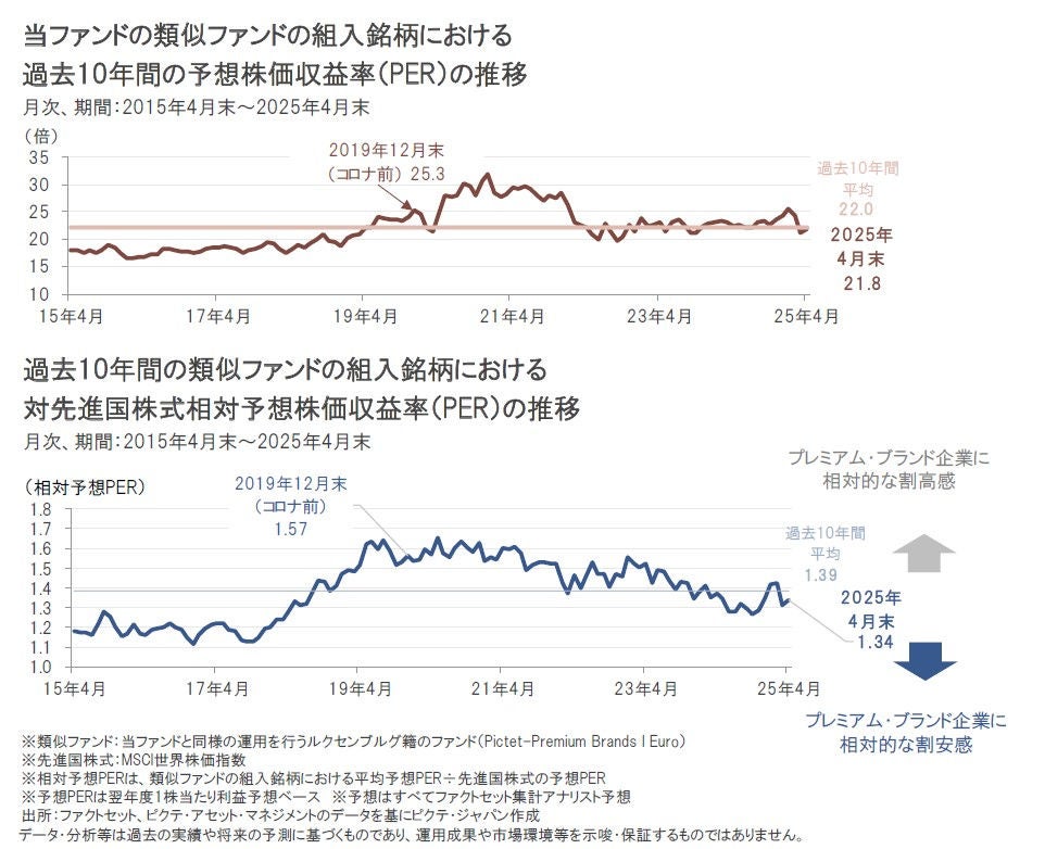 株価下落を受けて、プレミアム・ブランド企業の株式のバリュエーション(投資価値評価)水準は低下しています。当ファンドと同様の運用を行う類似ファンドの組入銘柄における予想株価収益率(PER)は、2025年4月末時点で過去10年間の平均をやや下回る水準に低下しました。