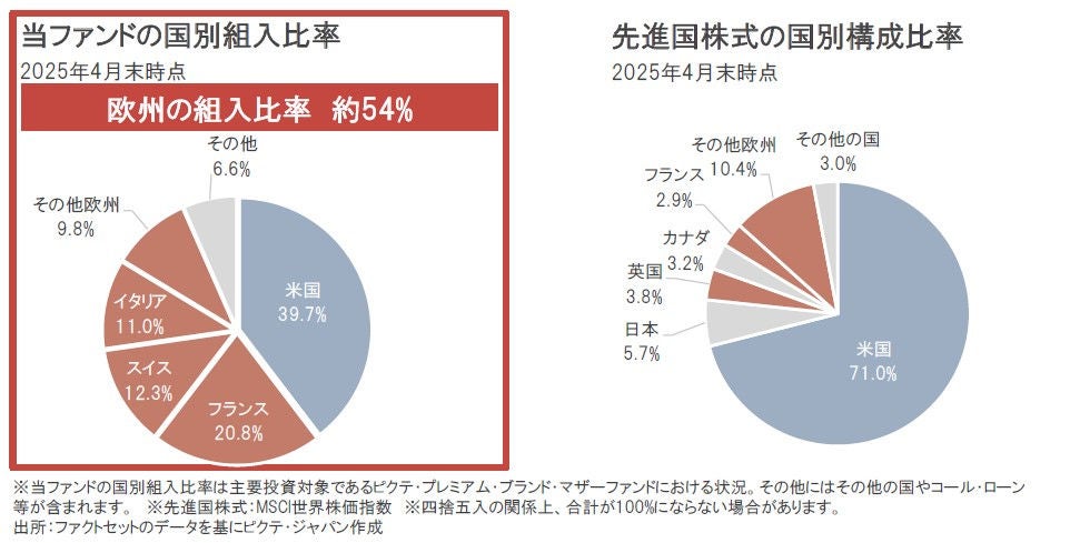 当ファンドの投資対象であるプレミアム・ブランド企業は、歴史的・文化的な背景などから、欧州を起源とする企業が比較的多く存在しています。2025年4月末時点の当ファンドの国別組入比率をみると、欧州の組入比率が合計で約54%となっています。