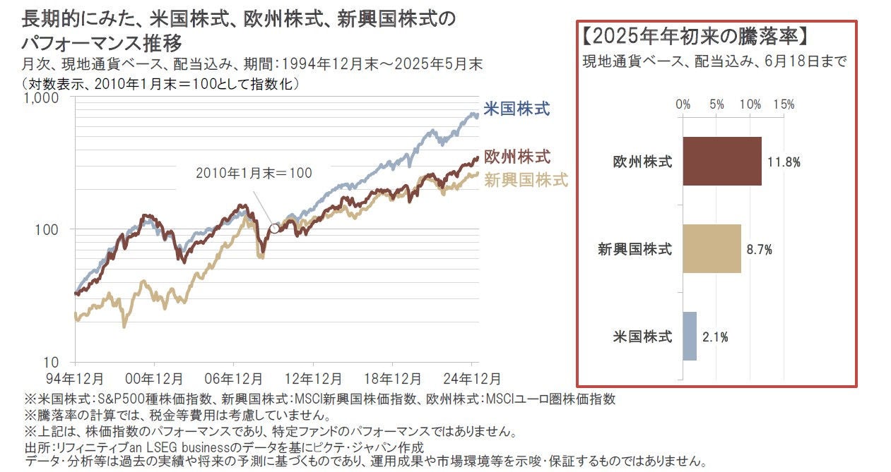 しかし、2025年年初来では、これまで好調であった米国株式が相対的に低調となった一方、出遅れ感があった欧州株式や新興国株式が相対的に良好なパフォーマンスを示しています(6月18日時点)。