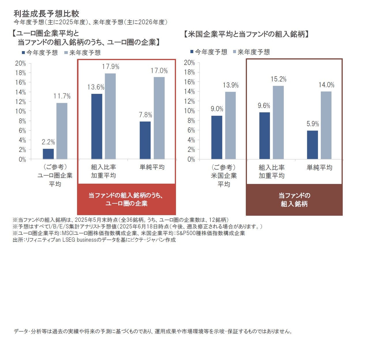 足元の企業利益の成長率予想について、ユーロ圏の企業同士で比較すると、当ファンドが2025年5月末時点で保有するユーロ圏のプレミアム・ブランド企業の平均は、ユーロ圏企業平均を上回る成長が予想されています。また、当ファンドの保有全銘柄(2025年5月末時点)の平均は、AI(人工知能)などのハイテク銘柄にけん引される米国企業平均に比べて、遜色のない成長が予想されています(予想はすべて、I/B/E/S集計アナリスト予想値、2025年6月18日時点)。