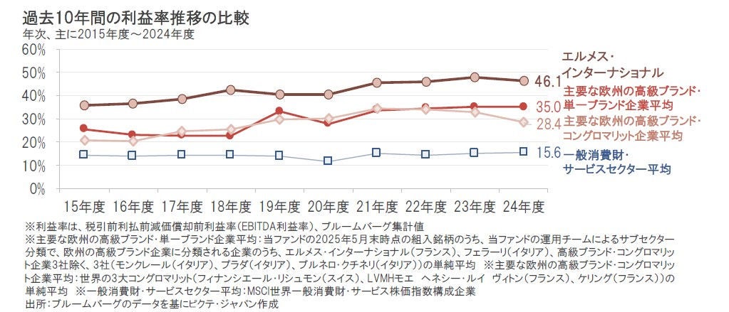 足元では、トランプ関税のほか、原材料価格、人件費、輸送費の高騰など、企業利益の圧迫要因になるとみられる懸念が山積していますが、プレミアム・ブランド企業には価格決定力があるため、コスト負担の増加分を最終価格に転嫁することは比較的容易であると考えられ、引き続き底堅い売上成長と、相対的に高い収益性の維持は可能であると予想されます。