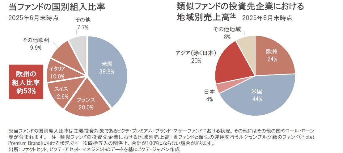 当ファンドの投資先であるプレミアム・ブランド企業は、欧州をはじめ先進国の企業が大部分を占めます。当ファンドの2025年6月末時点の国別組入比率をみても、欧州が約53%と高位を占め、そのほかも米国をはじめとした先進国が占めています。