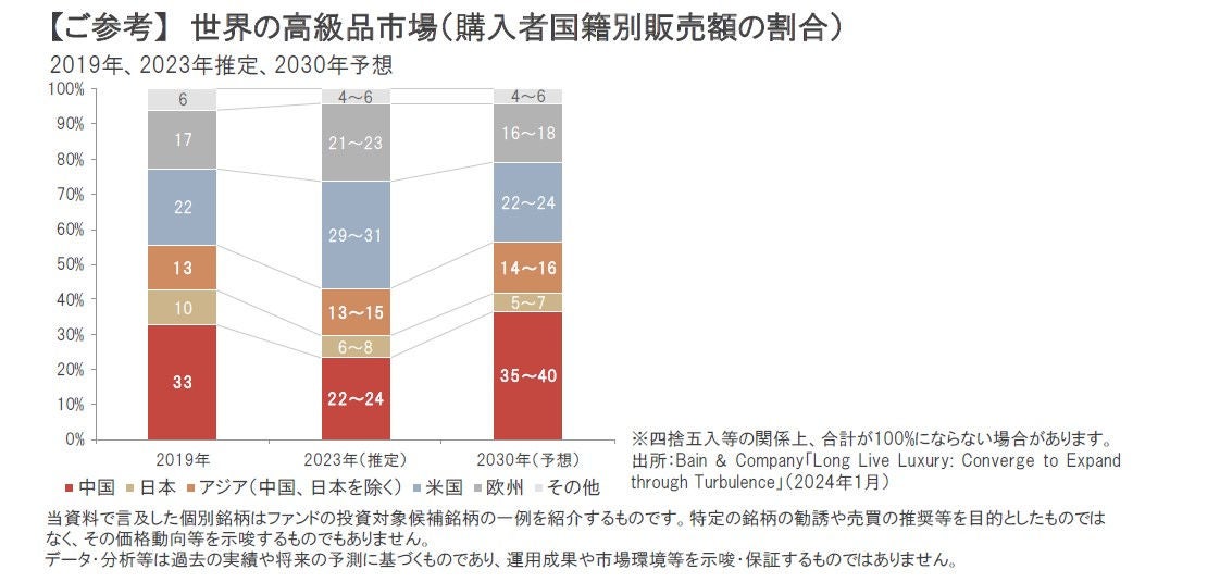 一方、投資先企業の地域別売上高をみると、米国やアジアなどグローバルに事業展開していることが示されています。また、当ファンドの投資先企業のうち、エルメス・インターナショナル(フランス)やフィナンシエール・リシュモン(スイス)などの欧州の高級ブランド企業では、中国をはじめとしたアジア(除く日本)の割合が売上高全体の約3~4割と、より大きな割合を占めています。