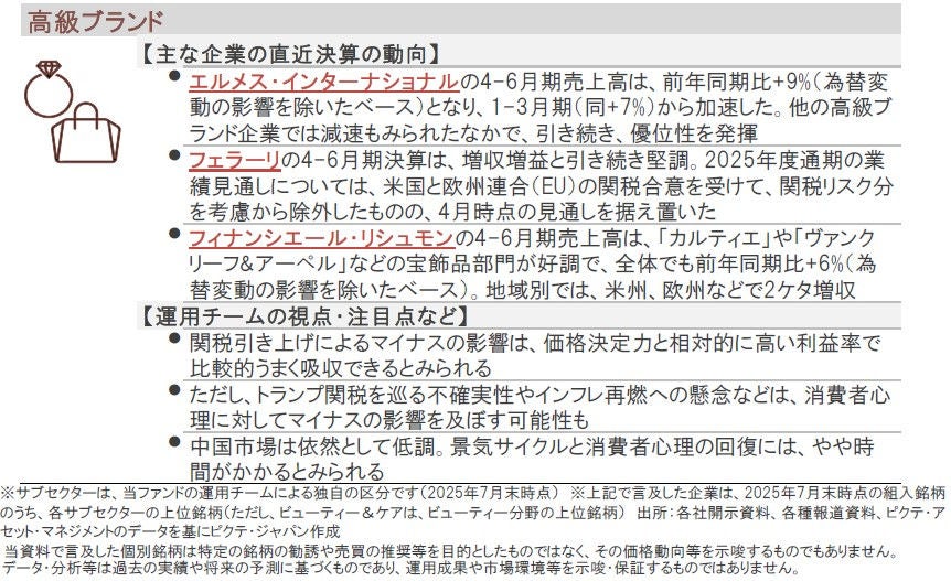 その後は値を戻しつつあるものの、先進国株式に比べると低調な状況が続いています。トランプ関税による企業利益や、世界の景気動向や消費者心理へのマイナスの影響を懸念する見方が根強いことに加えて、一部の企業から予想を下回る2025年4-6月期決算実績や慎重な今後の見通しが発表されたことなどが、プレミアム・ブランド企業の株価の重荷になっているとみられます。