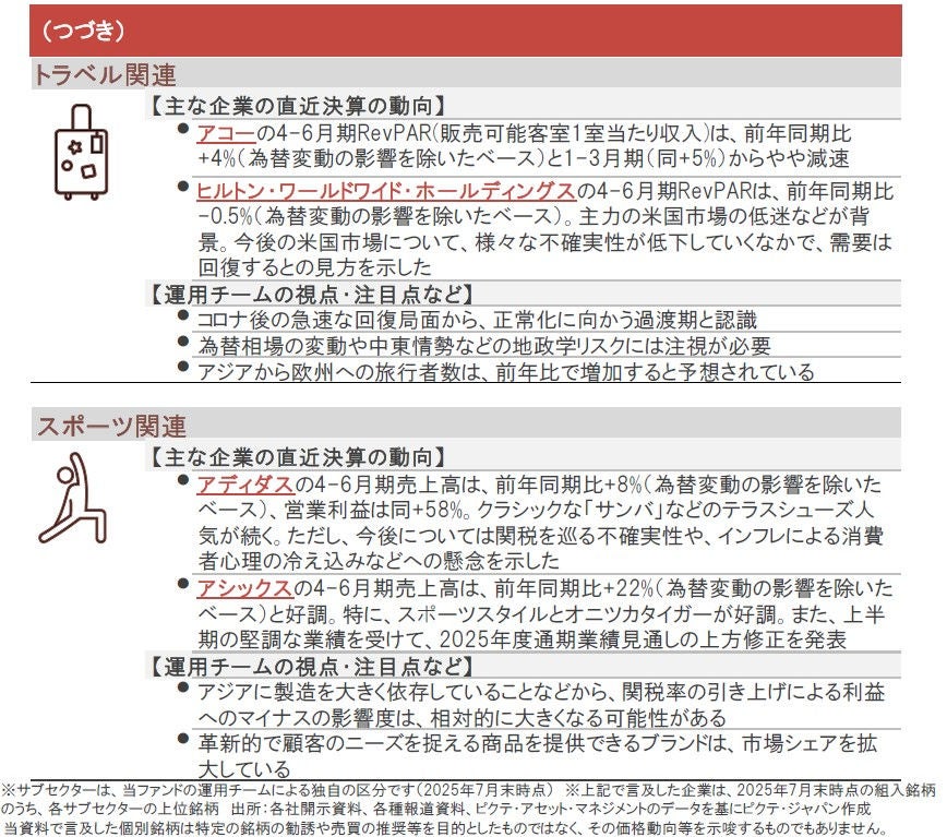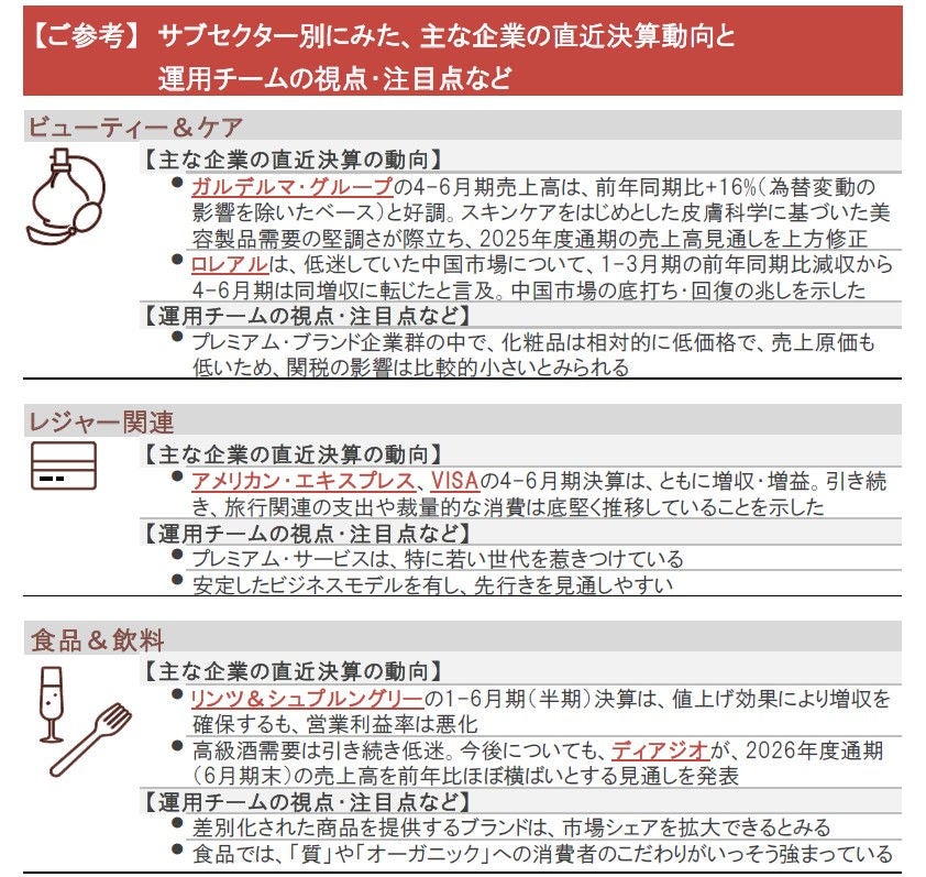 運用に際しては、関税負担などのコスト増加分を、商品価格の値上げで吸収できるような強力な価格決定力やキャッシュフロー創出力に注目し、銘柄選別をより強化していく方針です(後述の「【ご参考】 サブセクター別にみた、主な企業の直近決算動向と運用チームの視点・注目点など」も併せてご参照ください)。