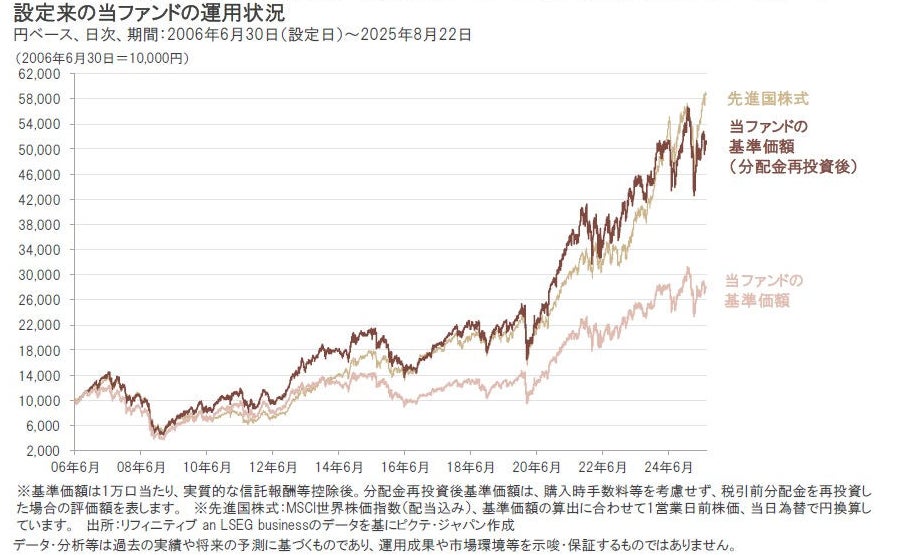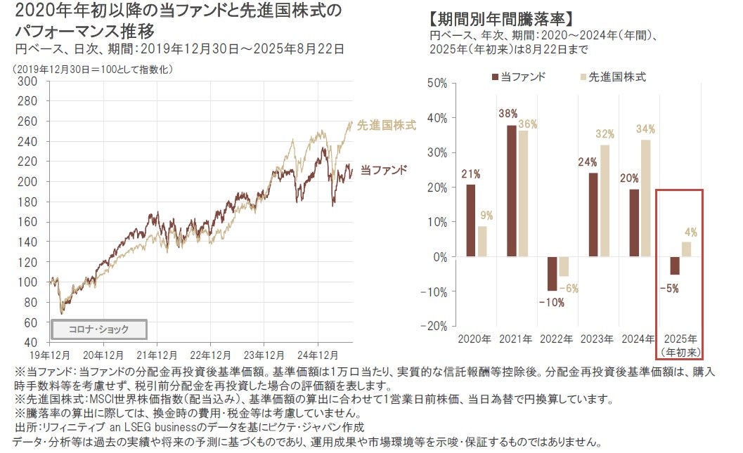 世界のプレミアム・ブランド企業の株式に投資を行う当ファンドの分配金再投資後基準価額は、2025年年初来(8月22日まで)で-5%となりました。円が米ドルに対して高進したことによる為替要因のマイナスに加えて、投資先であるプレミアム・ブランド企業の株価下落が響きました。