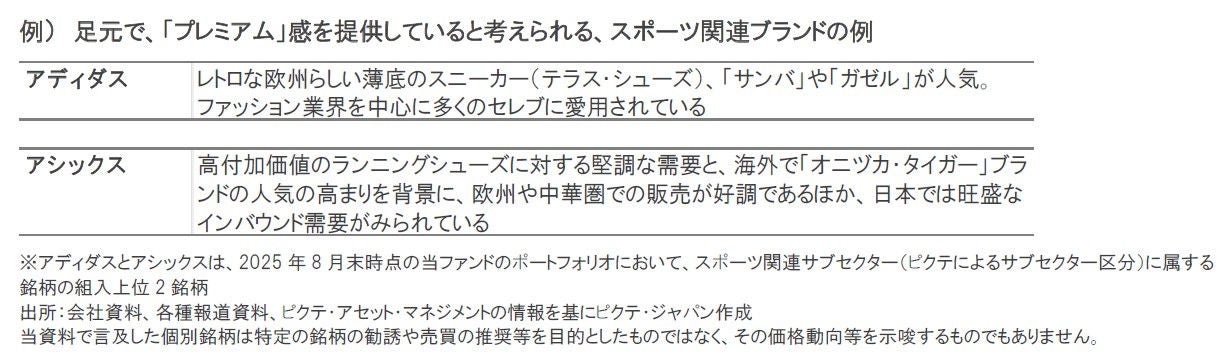 スポーツ関連ブランドの企業は、アウトドア・アクティビティやスポーツへの関心の高まりや、「経験」を重視する消費トレンドなどから恩恵を受けると期待されていますが、それに加えて、差別化され、革新的な商品を提供できる企業については、特に注目すべきと考えられます。こうした企業は、高級ブランド商品に比べると、もともと価格帯は手ごろであるほか、コロナ禍以降の値上げ幅も、高級ブランド企業に比べて大きくありませんでした。そのため、現在の「価格」設定は、革新性に基づいたものとみなされ、コストパフォーマンスの良い「プレミアム」感が得られると、消費者から認識されている模様です。