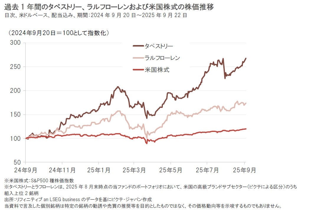 タペストリーとラルフローレンの過去1年間の株価動向をみると、関税による景気減速が懸念される米国市場の消費関連銘柄でありながらも、堅調な需要を背景に米国株式市場の平均を上回って推移しています(2025年9月22日時点)。