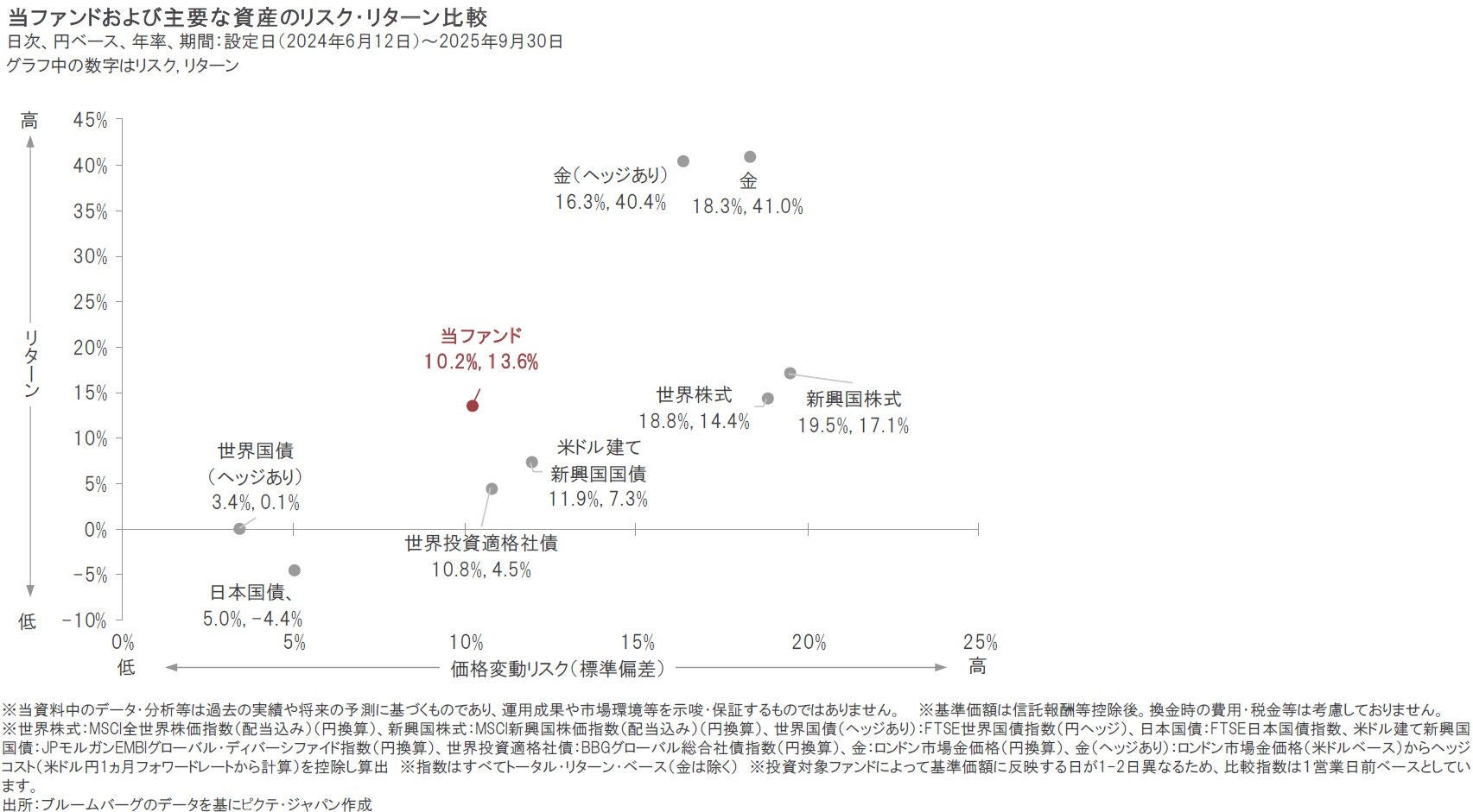 2025年9月は、現地通貨ベースでは、金、世界株式、米ドル建て新興国国債、世界国債、新興国株式がともに上昇しました。また、為替は、円が米ドル、ユーロに対して下落しました。