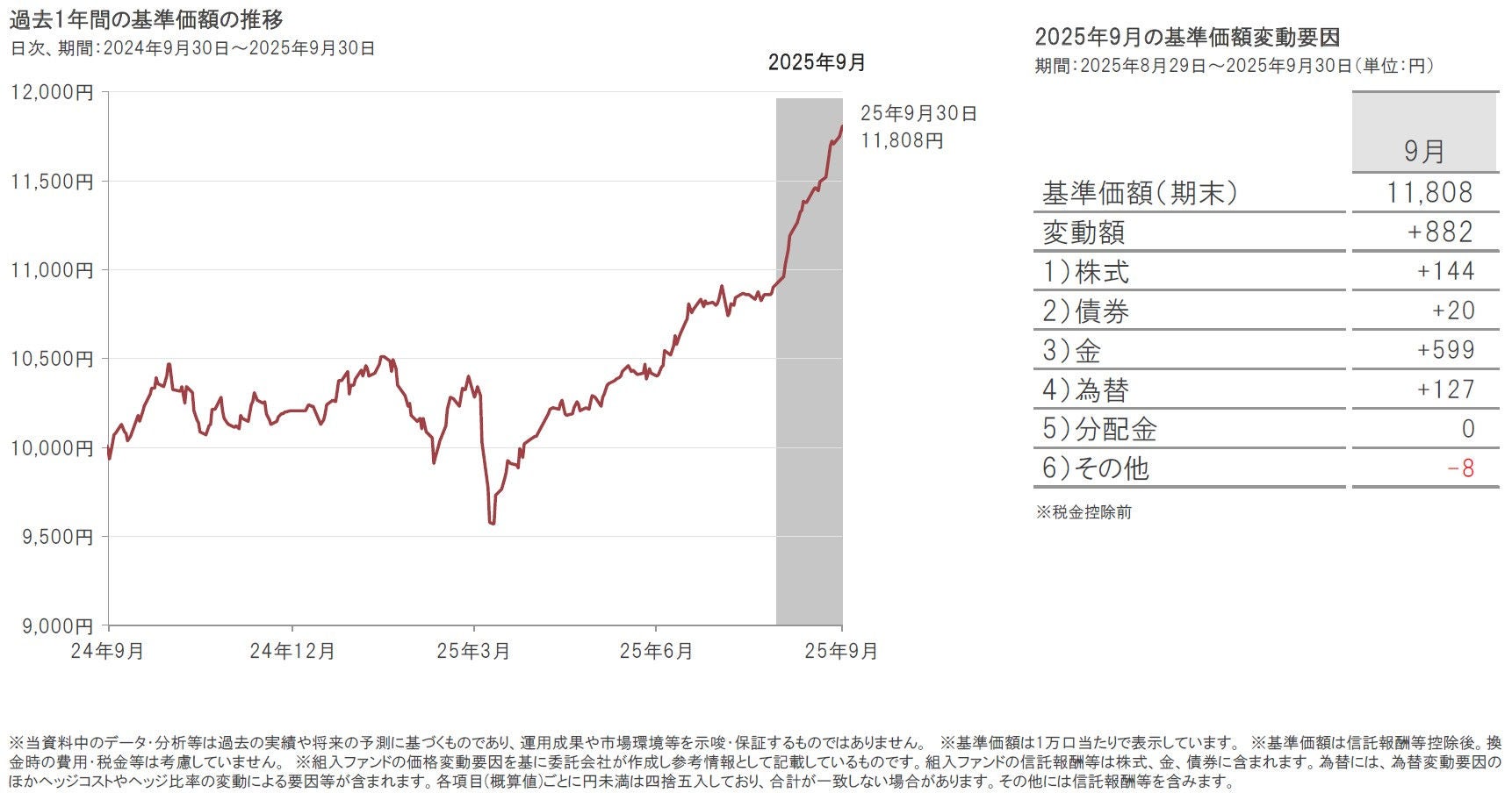 2025年9月30日の当ファンドの基準価額は、前月末比882円上昇(+8.1%)の11,808円となりました。