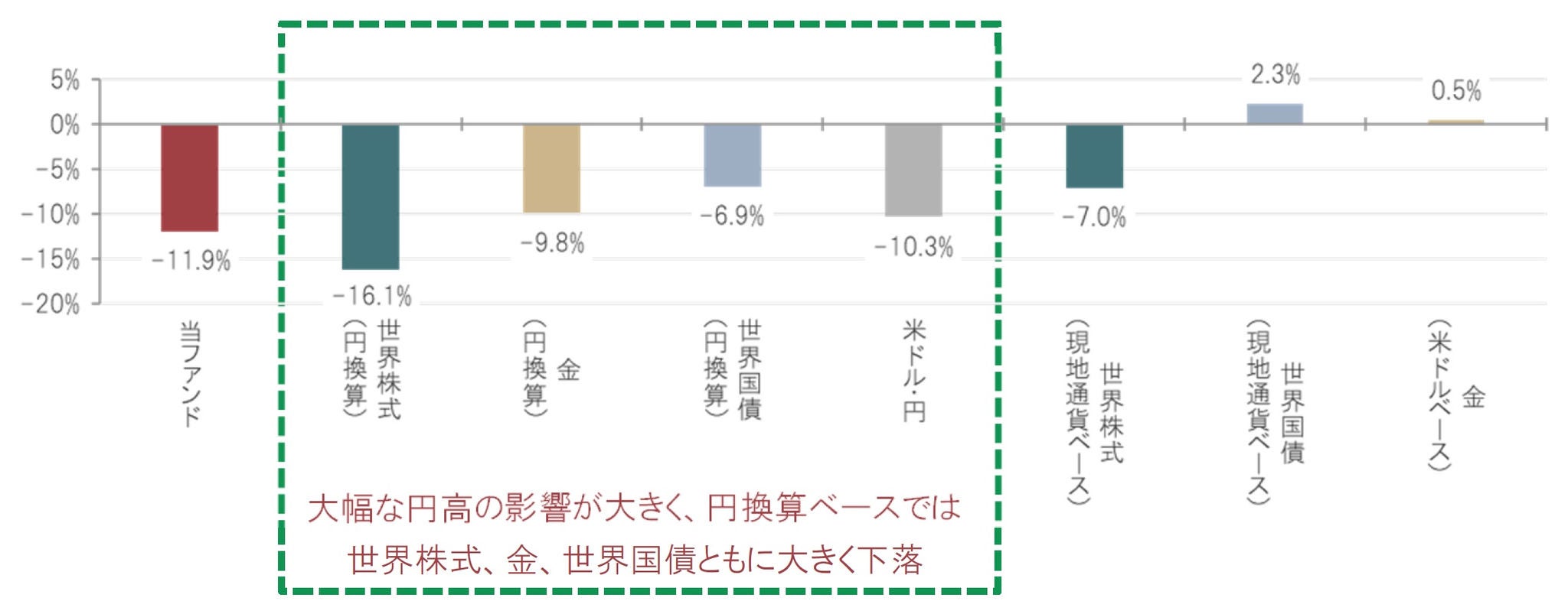 図表2:当ファンドと世界株式、世界国債、金、米ドル・円相場の騰落率(当ファンドの最高値から直近まで)