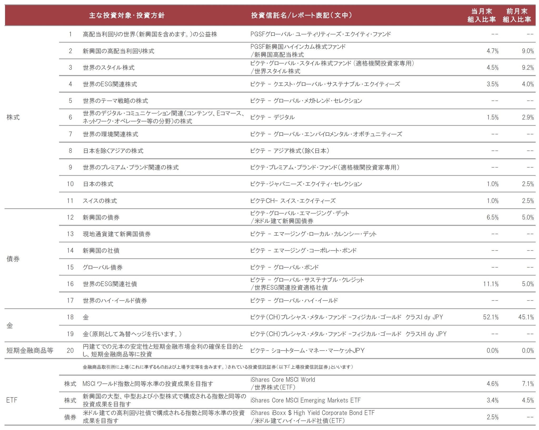 ※上記1、2はルクセンブルグ籍外国投資信託の受益証券、3、9は内国証券投資信託の受益証券、4~8、10、12~17はルクセンブルグ籍外国投資法人の投資証券、11、18、19はスイス籍外国投資信託の受益証券です。 ※“PGSF”は「ピクテ・グローバル・セレクション・ファンド」の略称です。 ※組入比率は、基準日時点の実質比率(マザーファンドの組入比率×マザーファンドにおける当該証券の組入比率)です。 ※上記の内容は、今後変更される場合があります。また、上記の中から投資する投資信託証券を選択するため、投資を行わないものもあります。