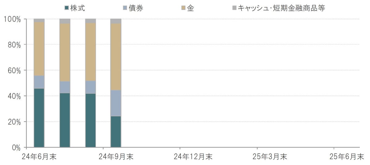 金については、中長期的に強気とする見方に変わりはなく、比率を引き上げました。昨今の地政学リスクに加えて、株式や債券などの伝統的資産クラスとの相関が低く、インフレに強い性質を有するとみられていることから、金については、引き続き、分散投資において重要かつ戦略的資産と位置付けています。