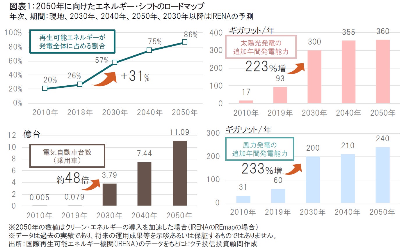 この「エネルギー変革シナリオ」では、2020年代に環境関連の投資が加速することが想定されています(図表1参照)。
