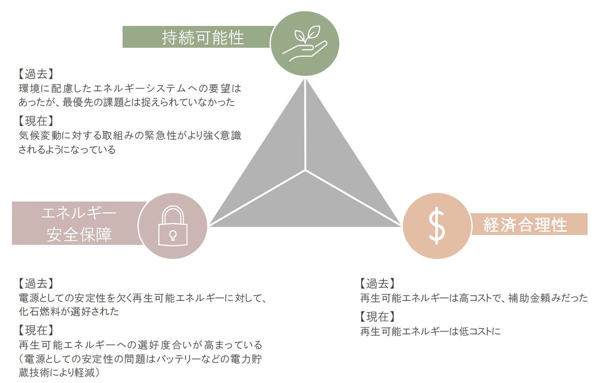 ピクテでは、以下に示す3つの原動力がエネルギー転換を推進すると考えています(図表2)。3つの原動力とは、具体的には、(1)持続可能性、(2)経済合理性、(3)エネルギー安全保障を指し、これらの原動力は過去と比べてより強まっています。