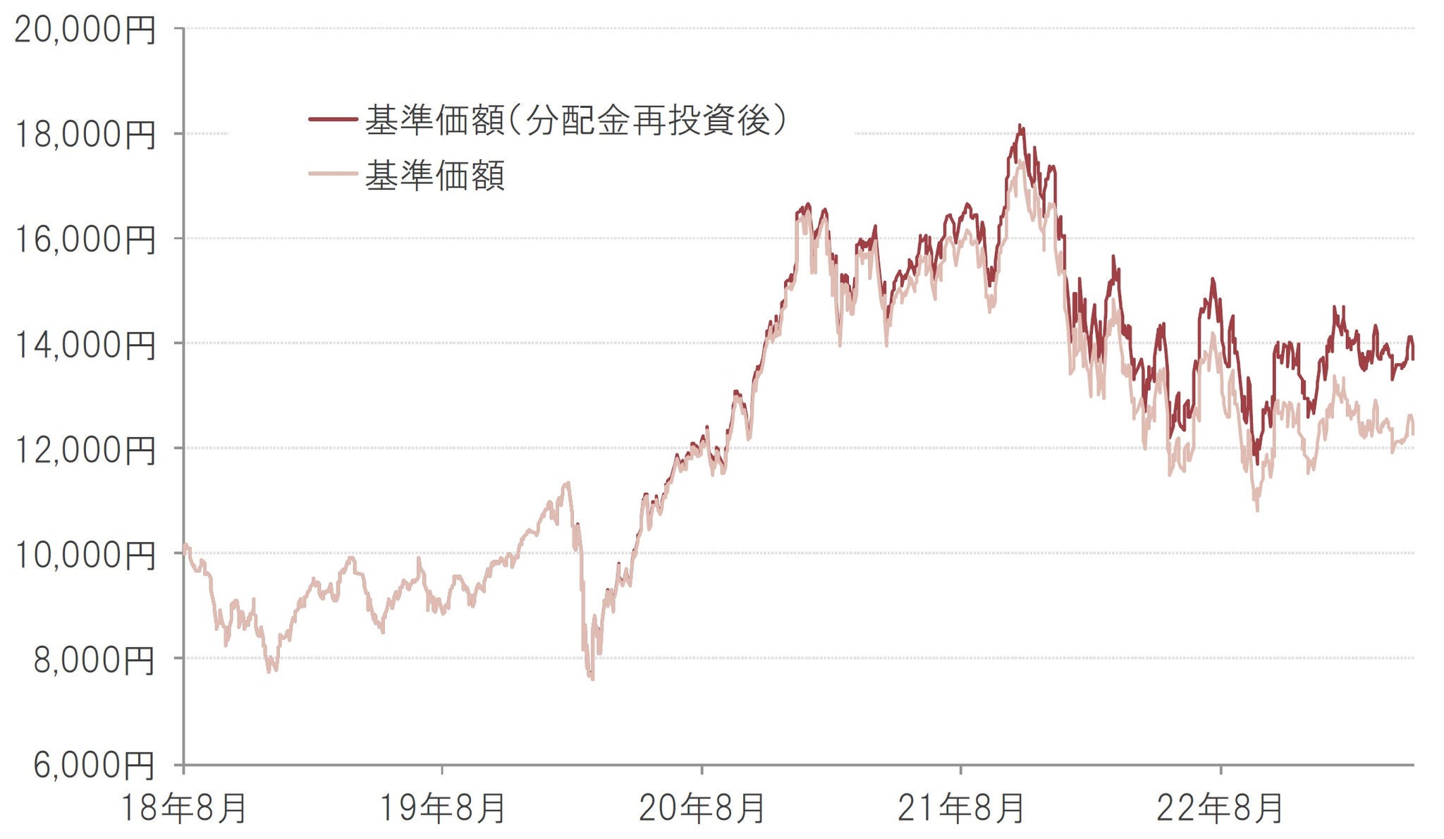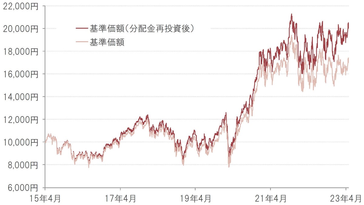 ※基準価額は1万口当たり、実質的な信託報酬等控除後。基準価額(分配金再投資後)は、購入時手数料等を考慮せず、税引前分配金を再投資した場合の評価額を表します。換金時の費用・税金等は考慮していません。