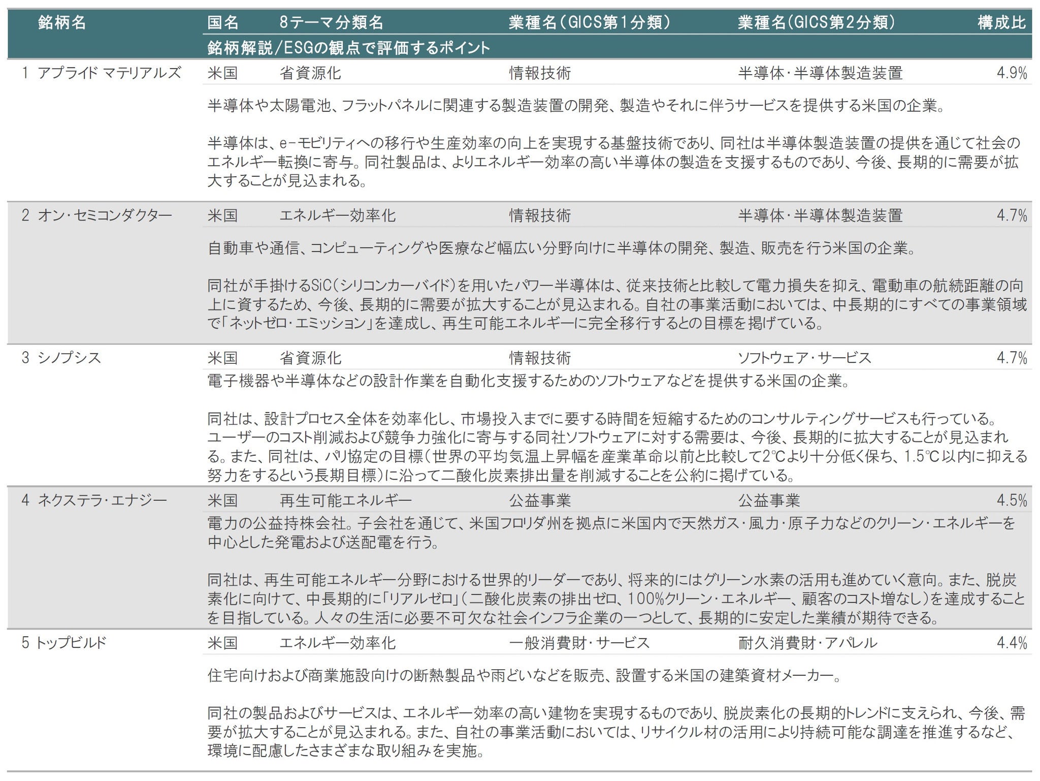 2023年8月末時点の組入比率首位は、米国のアプライドマテリアルズ(8テーマ分類:省資源化、業種(GICS第1分類):情報技術)です。同社は半導体製造装置の世界最大手で、半導体製造の前工程において使用される成膜装置の分野に強みを持っています。同社製品は、よりエネルギー効率の高い半導体の製造を支援するものであり、今後、長期的に需要が拡大することが見込まれます。