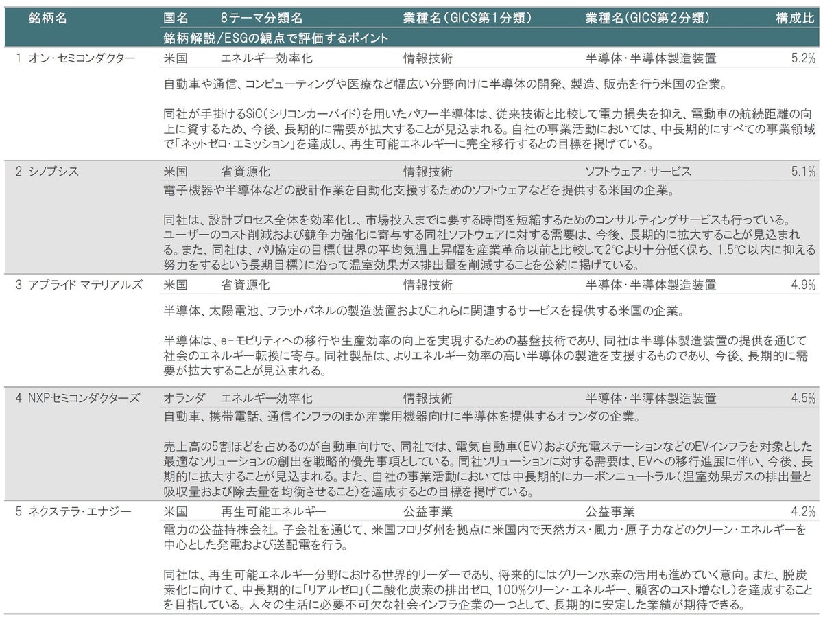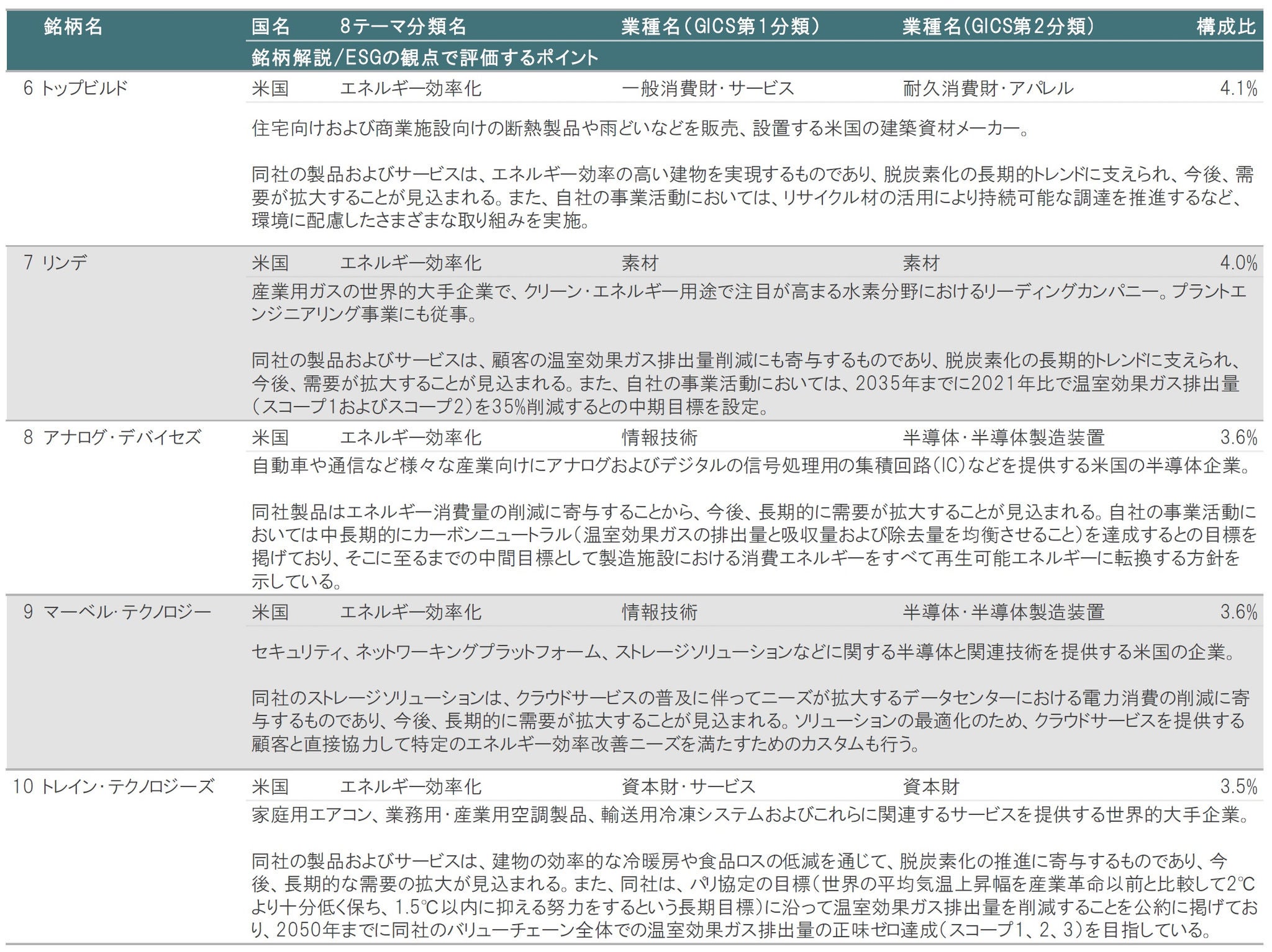 図表3、4に示したとおり、2023年9月末時点の組入上位10銘柄の内訳は、①8テーマ分類別では、エネルギー効率化が7銘柄、省資源化が2銘柄、再生可能エネルギーが1銘柄、②業種別(GICS第1分類)では、情報技術が6銘柄、公益事業が1銘柄、一般消費財・サービスが1銘柄、素材が1銘柄、資本財・サービスが1銘柄などとなっています。