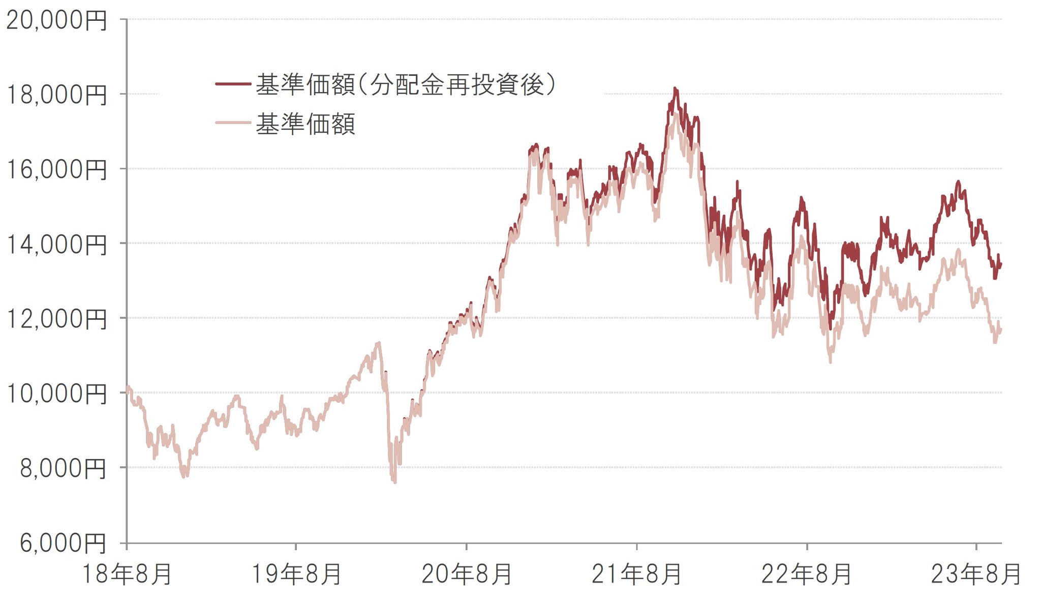 ※基準価額は1万口当たり、実質的な信託報酬等控除後。基準価額(分配金再投資後)は、購入時手数料等を考慮せず、税引前分配金を再投資した場合の評価額を表します。換金時の費用・税金等は考慮していません。