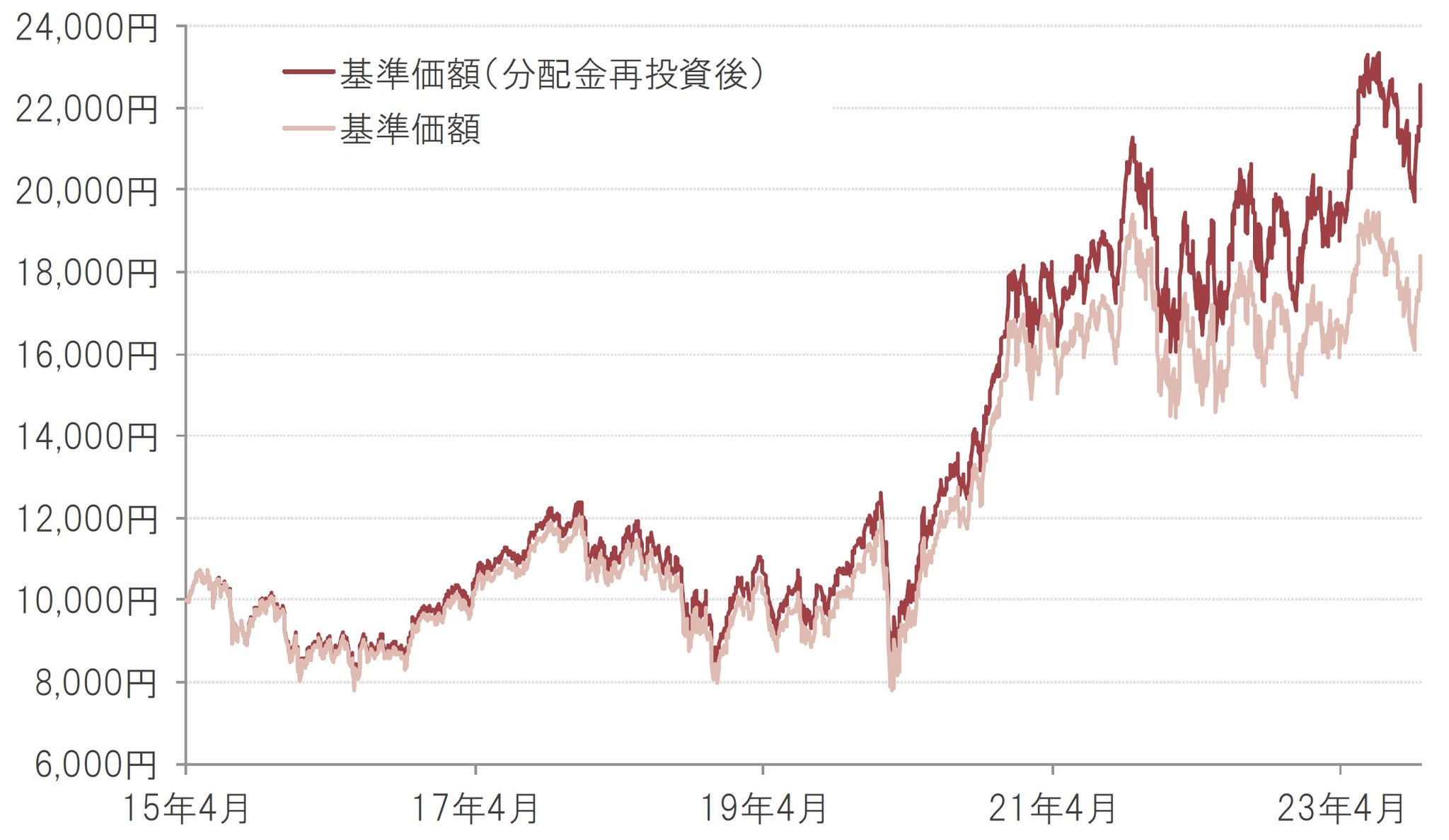 ※基準価額は1万口当たり、実質的な信託報酬等控除後。基準価額(分配金再投資後)は、購入時手数料等を考慮せず、税引前分配金を再投資した場合の評価額を表します。換金時の費用・税金等は考慮していません。