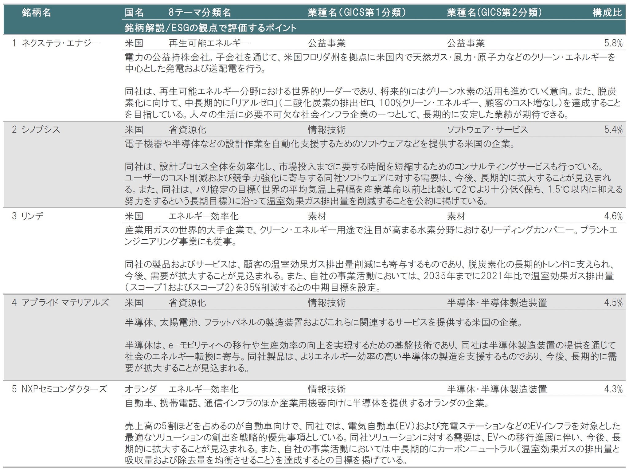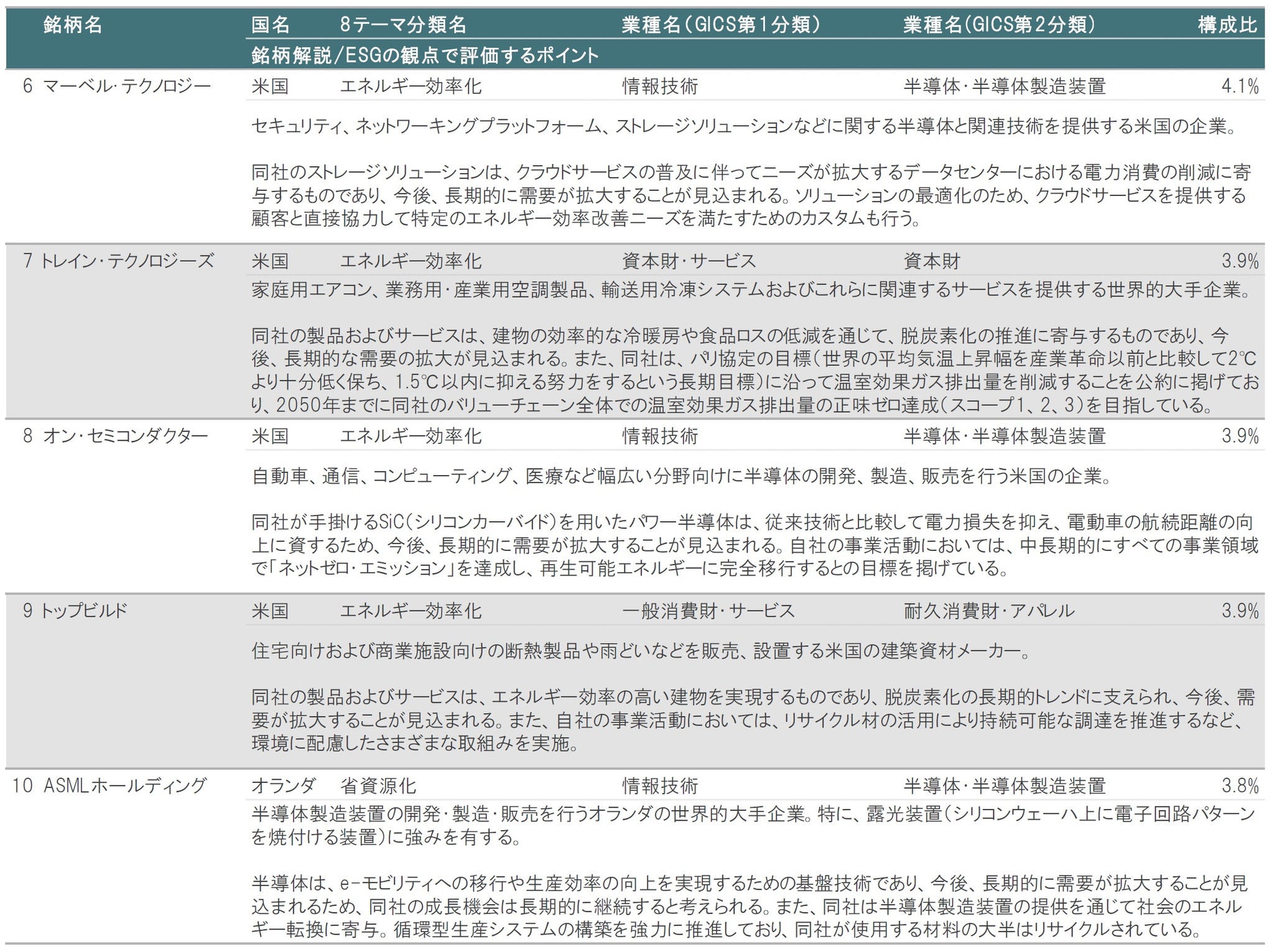 図表3、4に示したとおり、2023年10月末時点の組入上位10銘柄の内訳は、①8テーマ分類別では、エネルギー効率化が6銘柄、省資源化が3銘柄、再生可能エネルギーが1銘柄、②業種別(GICS第1分類)では、情報技術が6銘柄、公益事業が1銘柄、素材が1銘柄、資本財・サービスが1銘柄、一般消費財・サービスが1銘柄などとなっています。