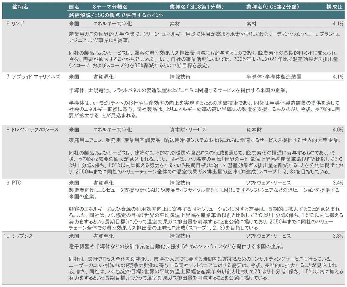 図表3、4に示したとおり、2023年12月末時点の組入上位10銘柄の内訳は、①8テーマ分類別では、エネルギー効率化が6銘柄、省資源化が3銘柄、再生可能エネルギーが1銘柄、②業種別(GICS第1分類)では、情報技術が6銘柄、公益事業が1銘柄、一般消費財・サービスが1銘柄、素材が1銘柄、資本財・サービスが1銘柄、などとなっています。