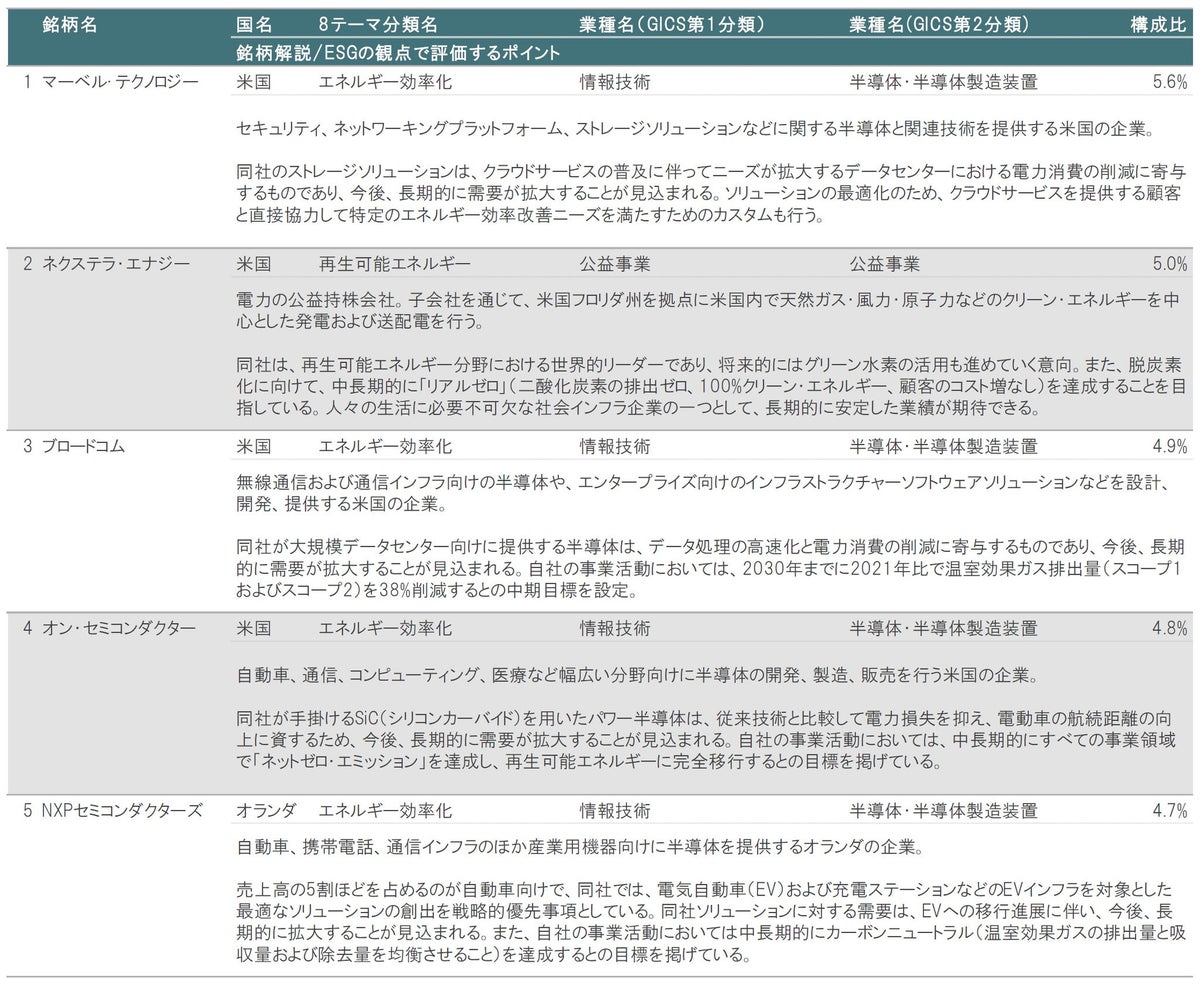 図表3、4に示したとおり、2024年1月末時点の組入上位10銘柄の内訳は、①8テーマ分類別では、エネルギー効率化が7銘柄、省資源化が2銘柄、再生可能エネルギーが1銘柄、②業種別(GICS第1分類)では、情報技術が6銘柄、公益事業が1銘柄、資本財・サービスが1銘柄、一般消費財・サービスが1銘柄、素材が1銘柄、などとなっています。
