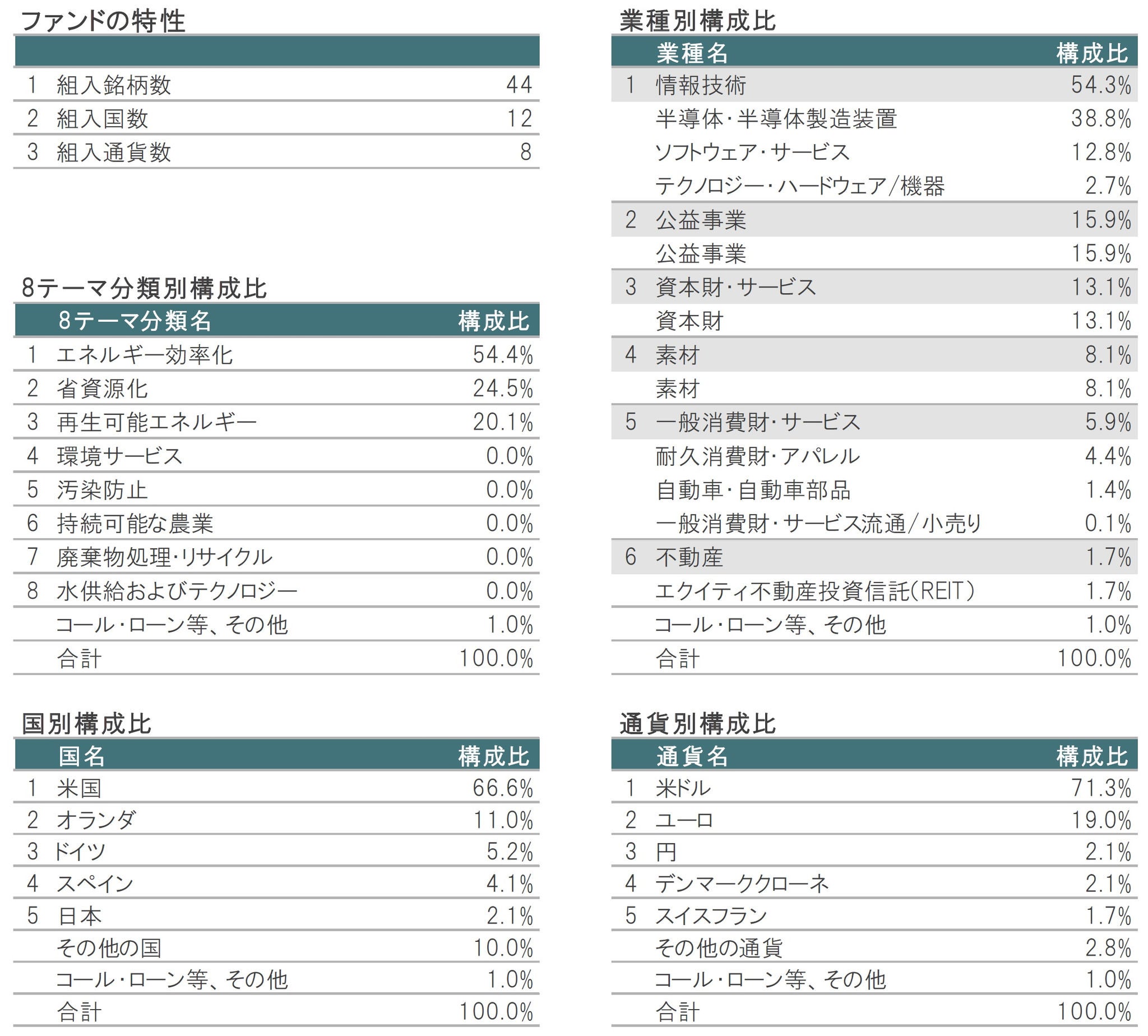 8テーマ分類別構成比については、エネルギー効率化が54.4%、省資源化が24.5%、再生可能エネルギーが20.1%などとなっています。業種別構成比( GICS第1分類)については、情報技術の比率が54.3%と過半を占めていますが、組入業種は多岐にわたります。