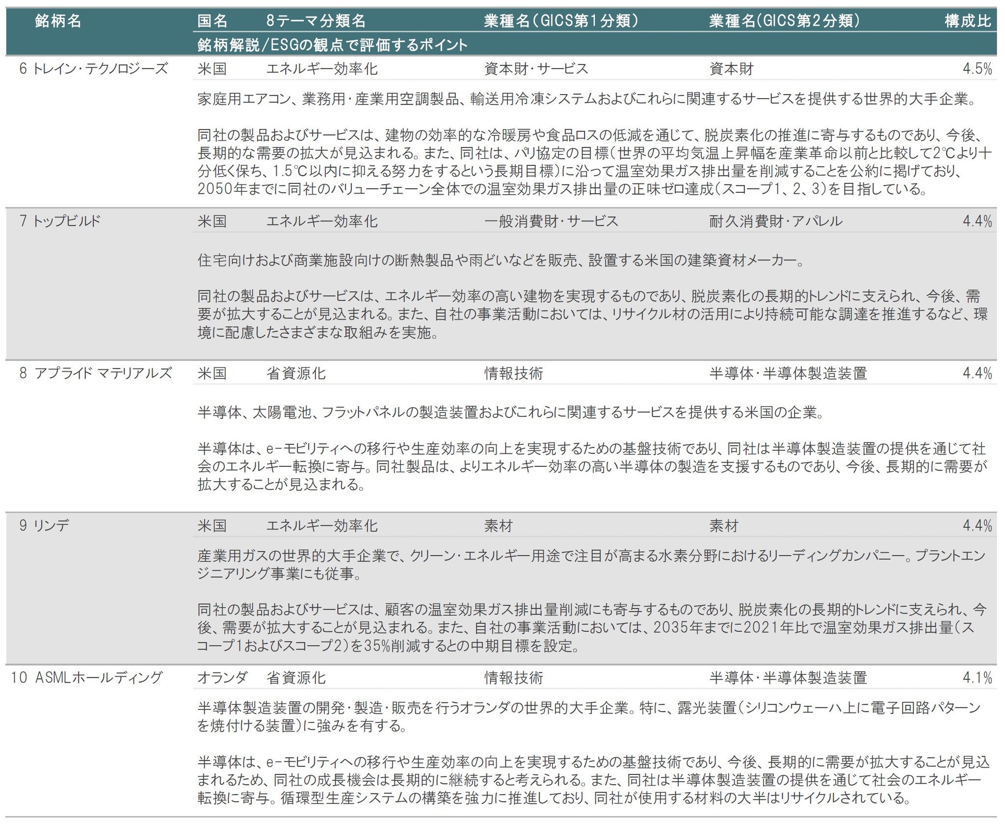 2024年1月末時点の組入上位10銘柄の顔ぶれを2023年12月末時点と比較すると、PTC(省資源化、情報技術)とシノプシス(省資源化、情報技術)に代わって、ASMLホールディング(省資源化、情報技術)が再登場したほか、ブロードコム(エネルギー効率化、情報技術)が新たに登場しました。