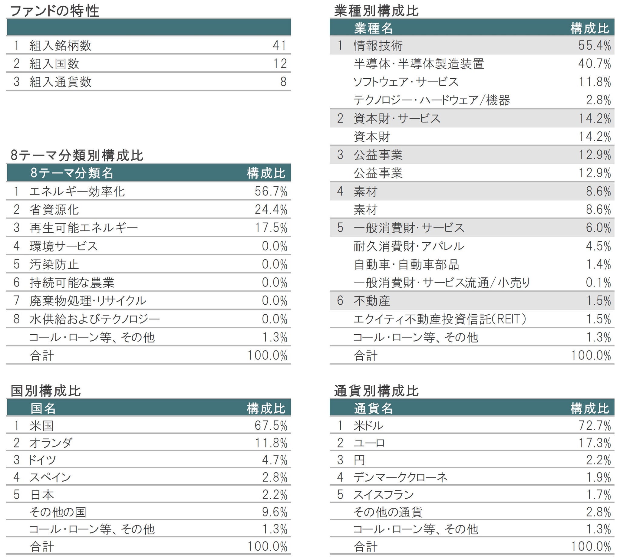 8テーマ分類別構成比については、エネルギー効率化が56.7%、省資源化が24.4%、再生可能エネルギーが17.5%などとなっています。業種別構成比( GICS第1分類)については、情報技術の比率が55.4%と過半を占めていますが、組入業種は多岐にわたります。