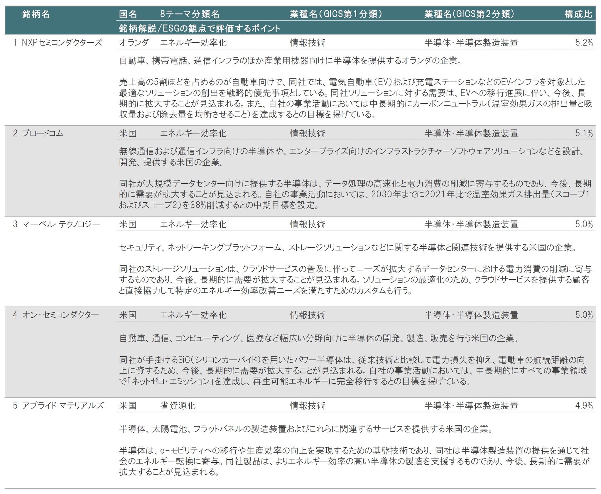 図表3、4に示したとおり、2024年2月末時点の組入上位10銘柄の内訳は、①8テーマ分類別では、エネルギー効率化が7銘柄、省資源化が2銘柄、再生可能エネルギーが1銘柄、②業種別(GICS第1分類)では、情報技術が6銘柄、資本財・サービスが1銘柄、素材が1銘柄、公益事業が1銘柄、一般消費財・サービスが1銘柄、などとなっています。