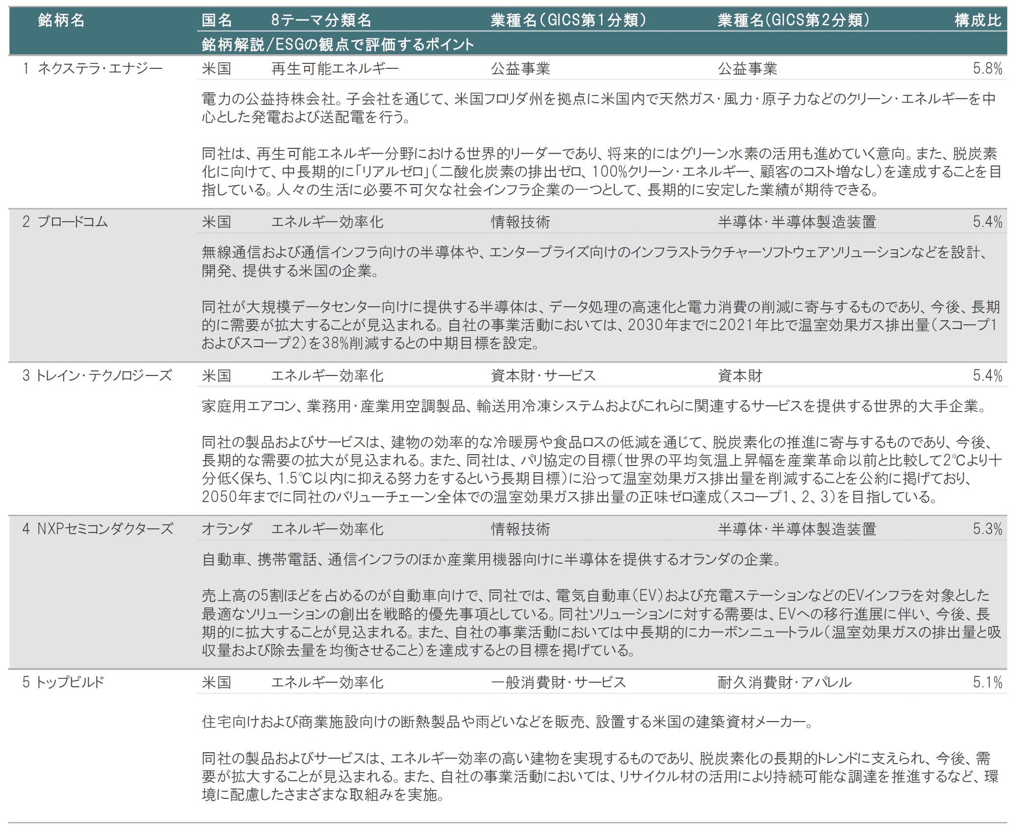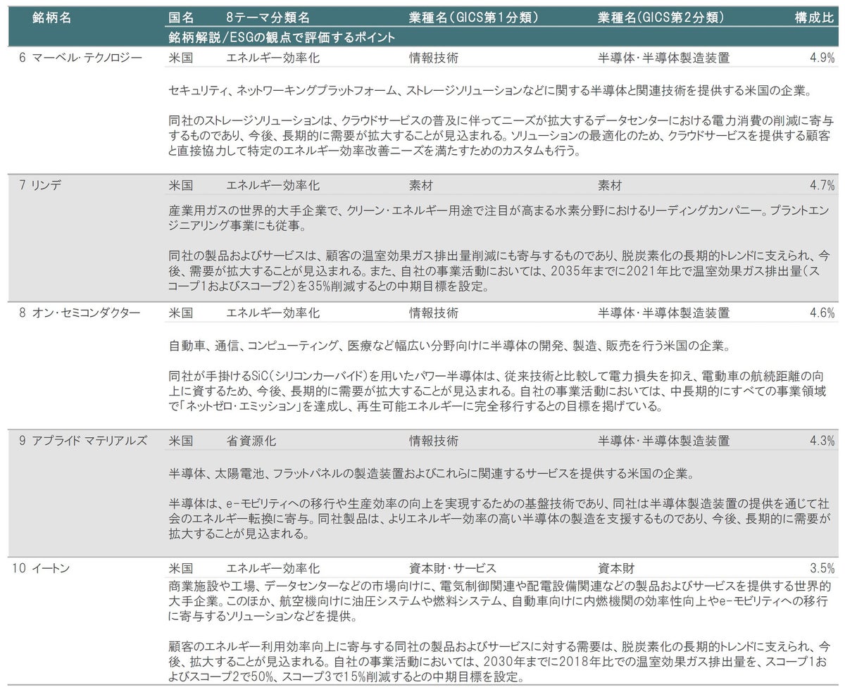 図表3、4に示したとおり、2024年4月末時点の組入上位10銘柄の内訳は、①8テーマ分類別では、エネルギー効率化が8銘柄、再生可能エネルギーが1銘柄、省資源化が1銘柄、②業種別(GICS第1分類)では、情報技術が5銘柄、公益事業が1銘柄、資本財・サービスが2銘柄、一般消費財・サービスが1銘柄、素材が1銘柄、などとなっています。