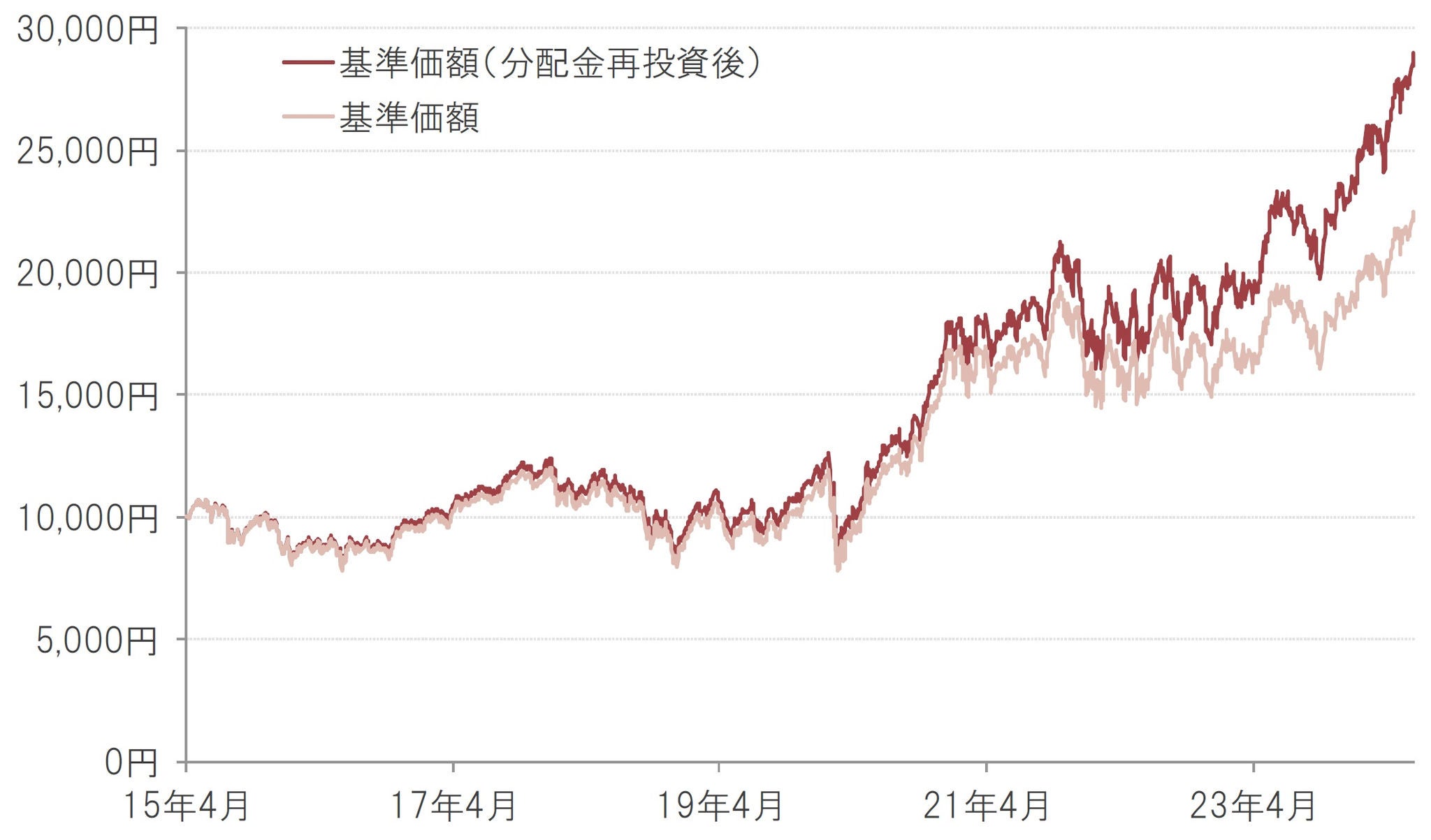 ※基準価額は1万口当たり、実質的な信託報酬等控除後。基準価額(分配金再投資後)は、購入時手数料等を考慮せず、税引前分配金を再投資した場合の評価額を表します。換金時の費用・税金等は考慮していません。