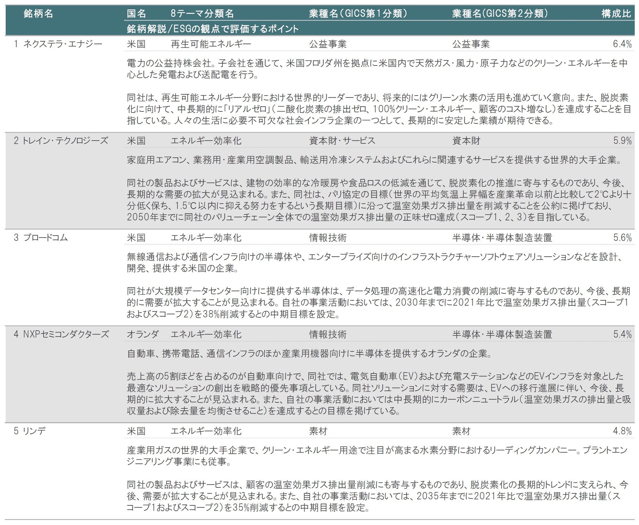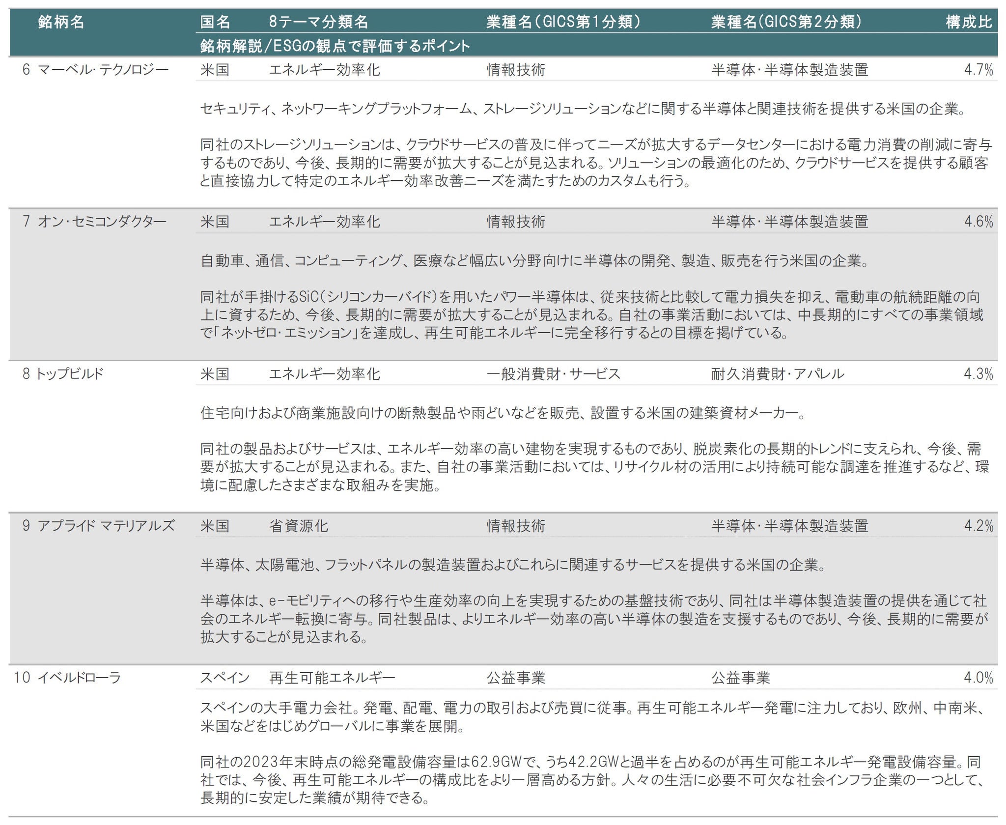 図表3、4に示したとおり、2024年6月末時点の組入上位10銘柄の内訳は、①8テーマ分類別では、エネルギー効率化が7銘柄、再生可能エネルギーが2銘柄、省資源化が1銘柄、②業種別(GICS第1分類)では、情報技術が5銘柄、公益事業が2銘柄、資本財・サービスが1銘柄、素材が1銘柄、一般消費財・サービスが1銘柄、などとなっています。