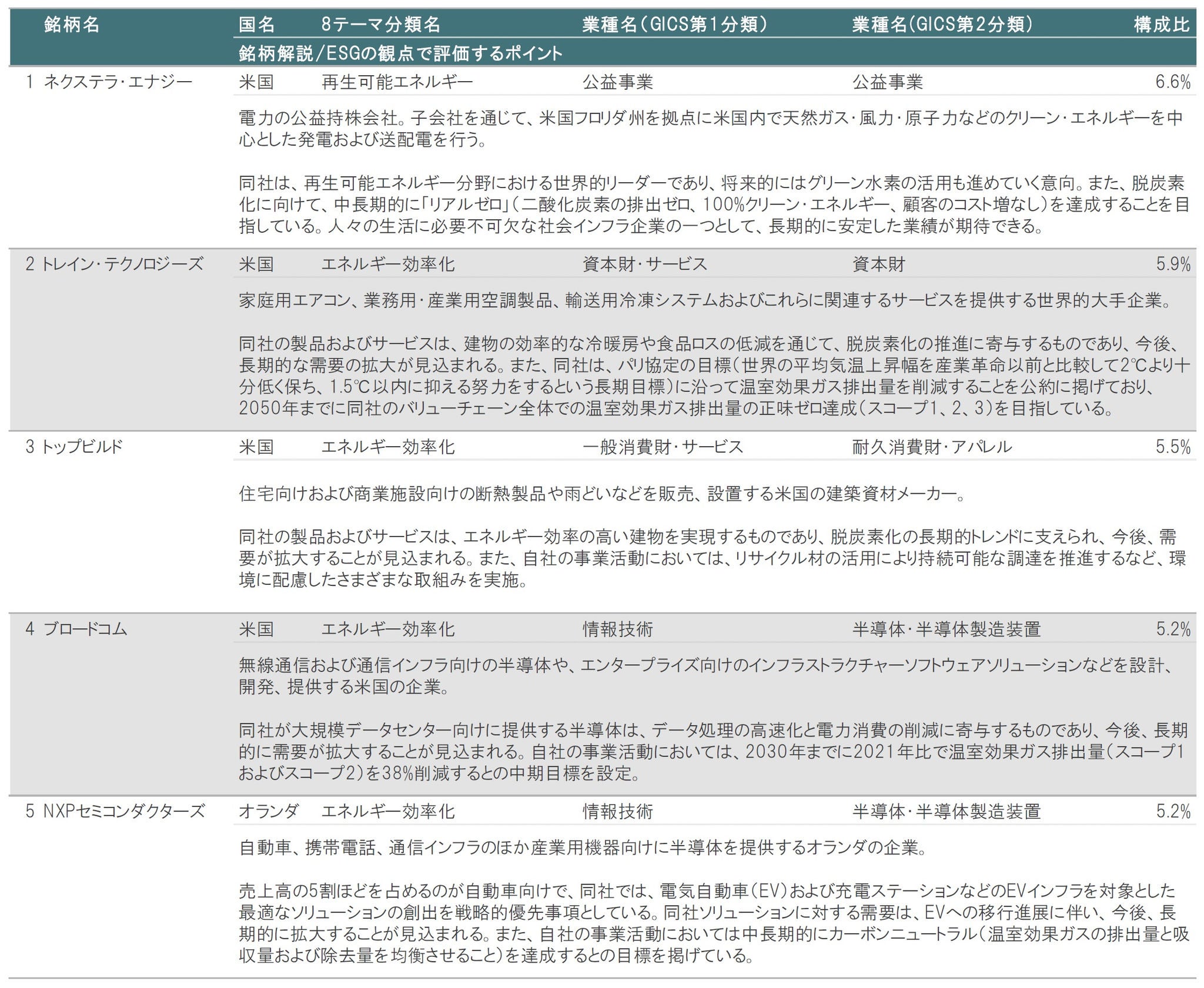 図表3、4に示したとおり、2024年7月末時点の組入上位10銘柄の内訳は、①8テーマ分類別では、エネルギー効率化が7銘柄、再生可能エネルギーが2銘柄、省資源化が1銘柄、②業種別(GICS第1分類)では、情報技術が5銘柄、公益事業が2銘柄、資本財・サービスが1銘柄、一般消費財・サービスが1銘柄、素材が1銘柄、などとなっています。なお、2024年6月末時点と比較して、2024年7月末時点の組入上位10銘柄の顔ぶれに変化はありませんでした。