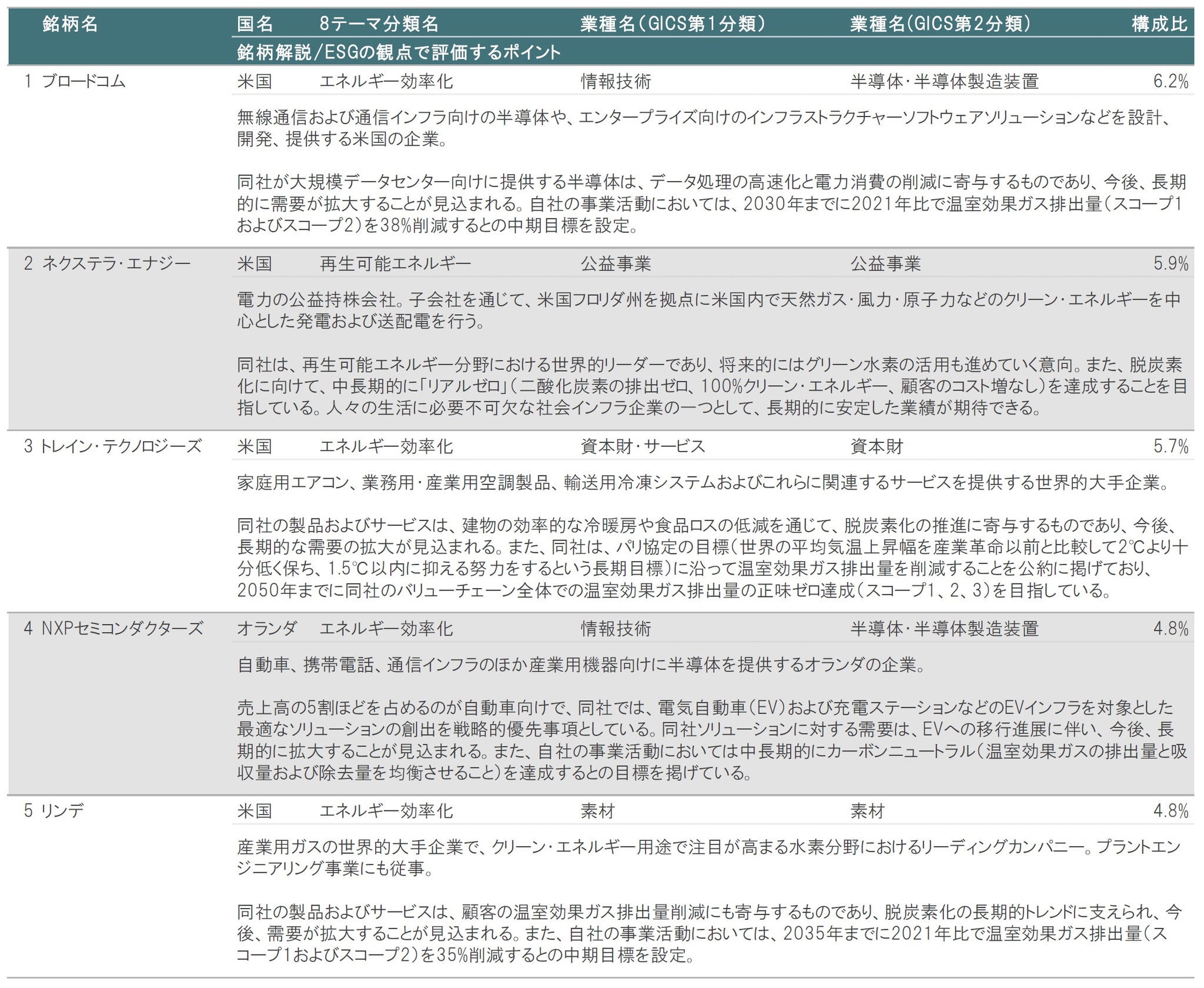 図表3、4に示したとおり、2024年9月末時点の組入上位10銘柄の内訳は、①8テーマ分類別では、エネルギー効率化が7銘柄、再生可能エネルギーが2銘柄、省資源化が1銘柄、②業種別(GICS第1分類)では、情報技術が5銘柄、公益事業が2銘柄、資本財・サービスが1銘柄、素材が1銘柄、一般消費財・サービスが1銘柄、などとなっています。