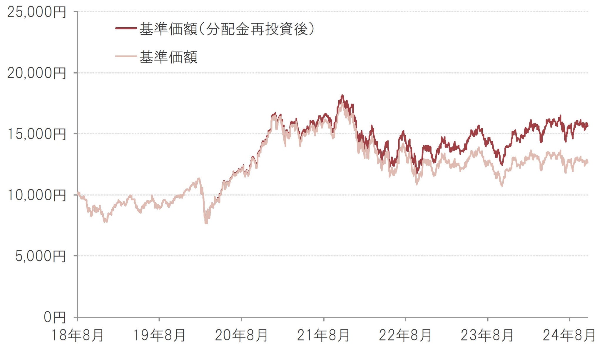 ※基準価額は1万口当たり、実質的な信託報酬等控除後。基準価額(分配金再投資後)は、購入時手数料等を考慮せず、税引前分配金を再投資した場合の評価額を表します。換金時の費用・税金等は考慮していません。