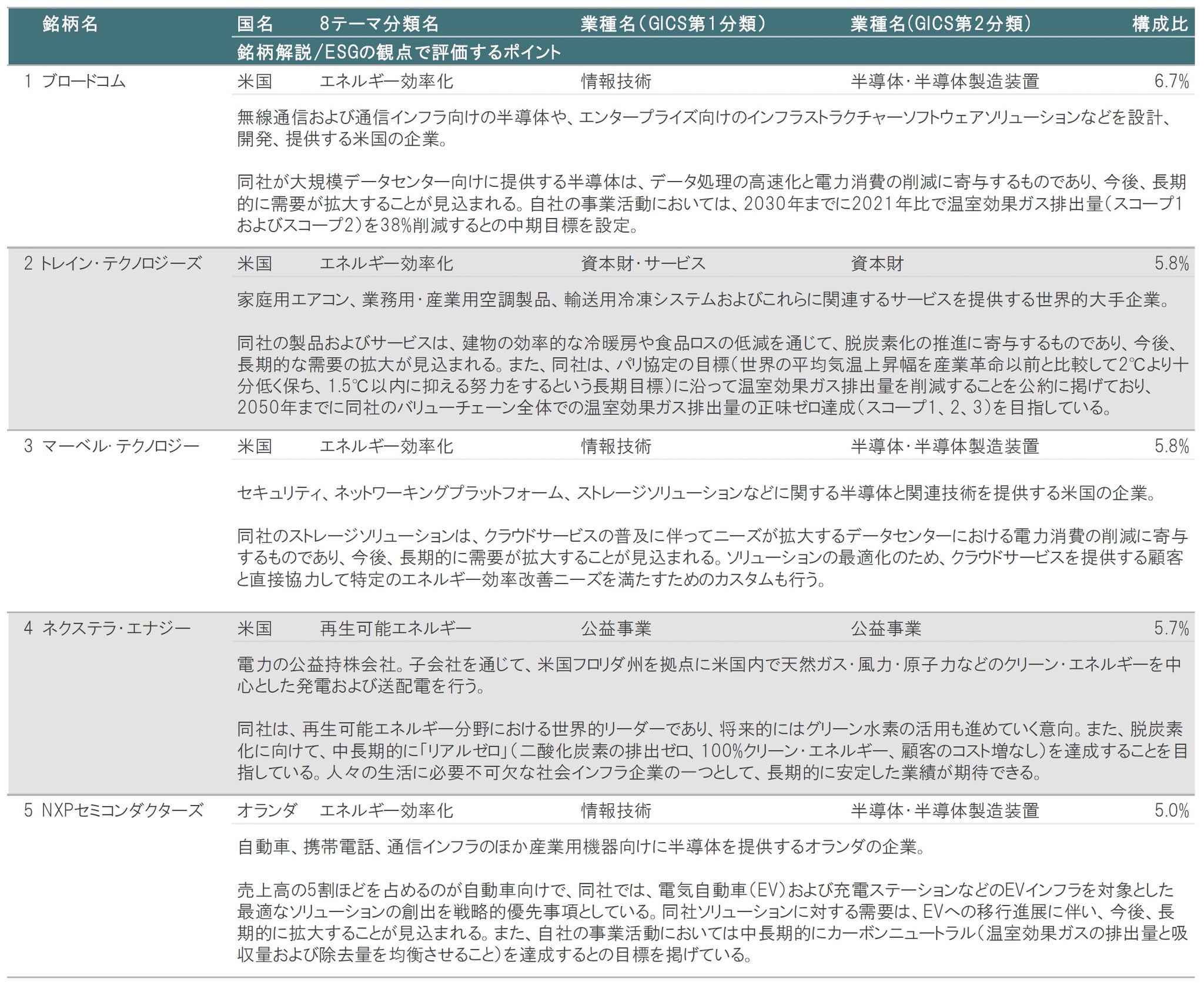 2024年10月末時点の組入上位10銘柄の顔ぶれを2024年9月末時点と比較すると、アプライド マテリアルズ(省資源化、情報技術)に代わって、イートン(エネルギー効率化、資本財・サービス)が再登場しました。