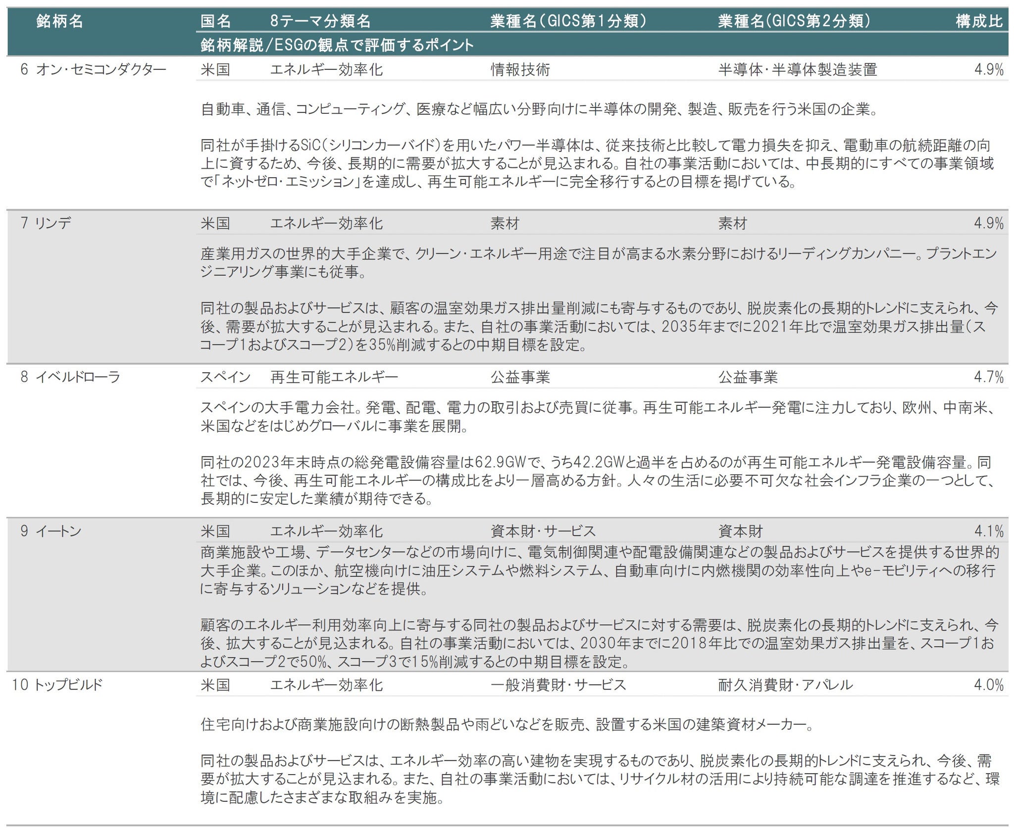 図表3、4に示したとおり、2024年10月末時点の組入上位10銘柄の内訳は、①8テーマ分類別では、エネルギー効率化が8銘柄、再生可能エネルギーが2銘柄、②業種別(GICS第1分類)では、情報技術が4銘柄、資本財・サービスが2銘柄、公益事業が2銘柄、素材が1銘柄、一般消費財・サービスが1銘柄、などとなっています。